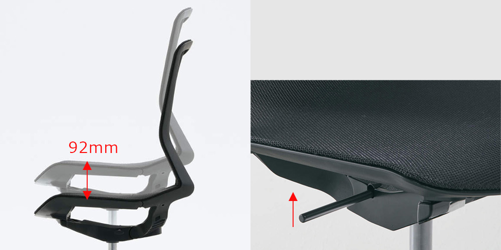 座面の右下にあるレバーを持ち上げることで、体格にあわせて座面の高さ調節が可能です。(ストローク:92mm)