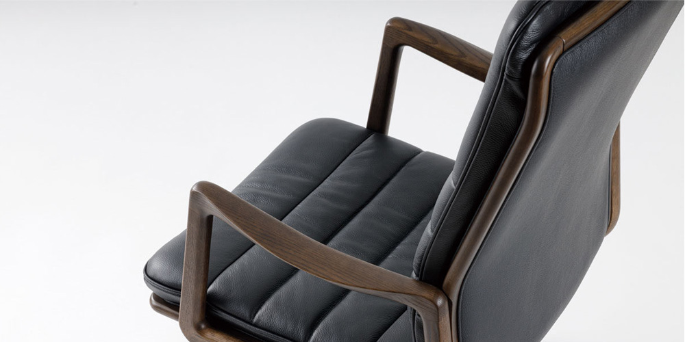 肘木部分には良質なオーク無垢材を使用しています。程よい曲線で滑らかな触り心地に、天然木ならではの温もりを感じます。アームは腕に馴染みやすいように設計されています。※天然木を使用している為、木目や色味は一点ごとに異なります。