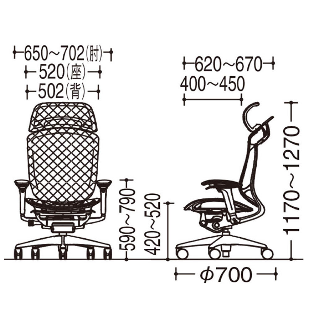幅(肘含む)650〜702x奥行620〜670x高さ(背)1170〜1270