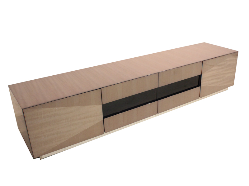 天板、側板、前板全て45度のカットをして表面、上面、側面の突板のつながりを表現しています。台輪はアルミミラーパネルを貼り、ボックスが宙に浮いているような表情。また、中央部のダークグレーガラスがアクセントになっています。