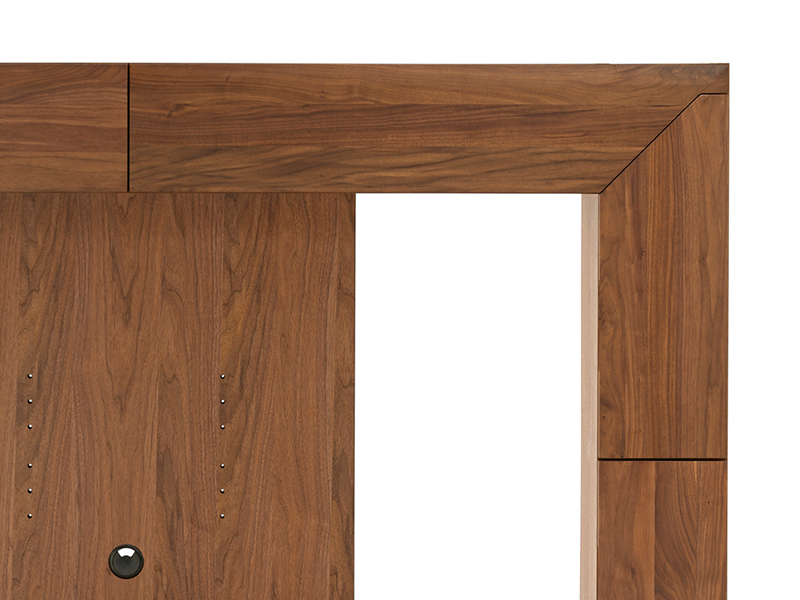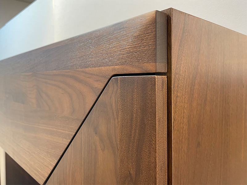 上部と左右を囲う収納部分の前板には、絶妙な角度で傾斜を付けています。厚みを持たせた前板だからこそできるデザインで、木材特有のやさしい質感を強調しています。