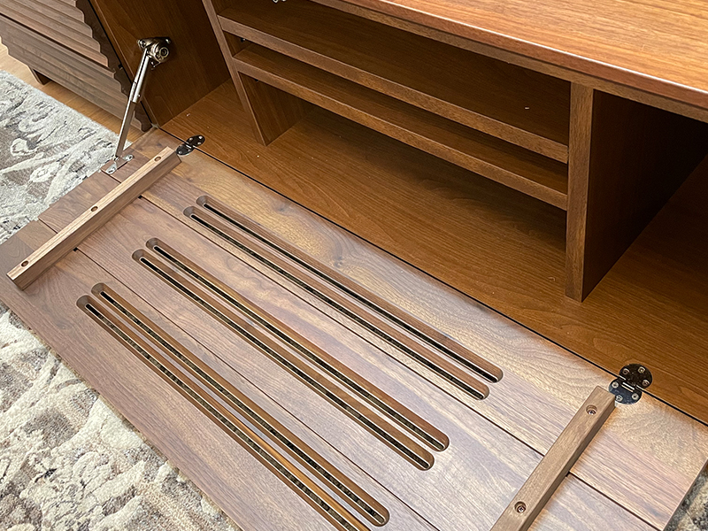 テレビ台の前板はモダンでスタイリッシュな印象となるスリットデザインになっています。凹凸があることで陰影が生まれ、無垢材の持つ豊かな表情を楽しむことができます。
