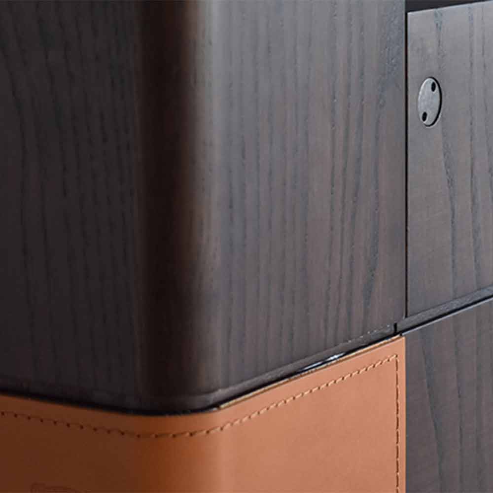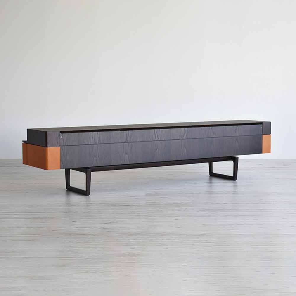 前面の扉部から側面にかけてはサドルレザーを使用しその他の部分にはアッシュ材を使用。シンプルでありながらデザイン性のあるフラウ社ならではのテレビボードです。
