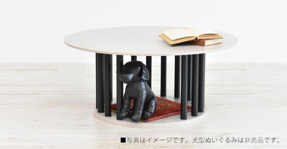 円柱型の細い脚で天板を支えているカジュアルなデザインのセンターテーブル。天板下の空間は、ペットのくつろぎスペースとして活用できます。もちろん、雑誌などを置く仮収納として使うなど、多様性を持ったアイテムです。