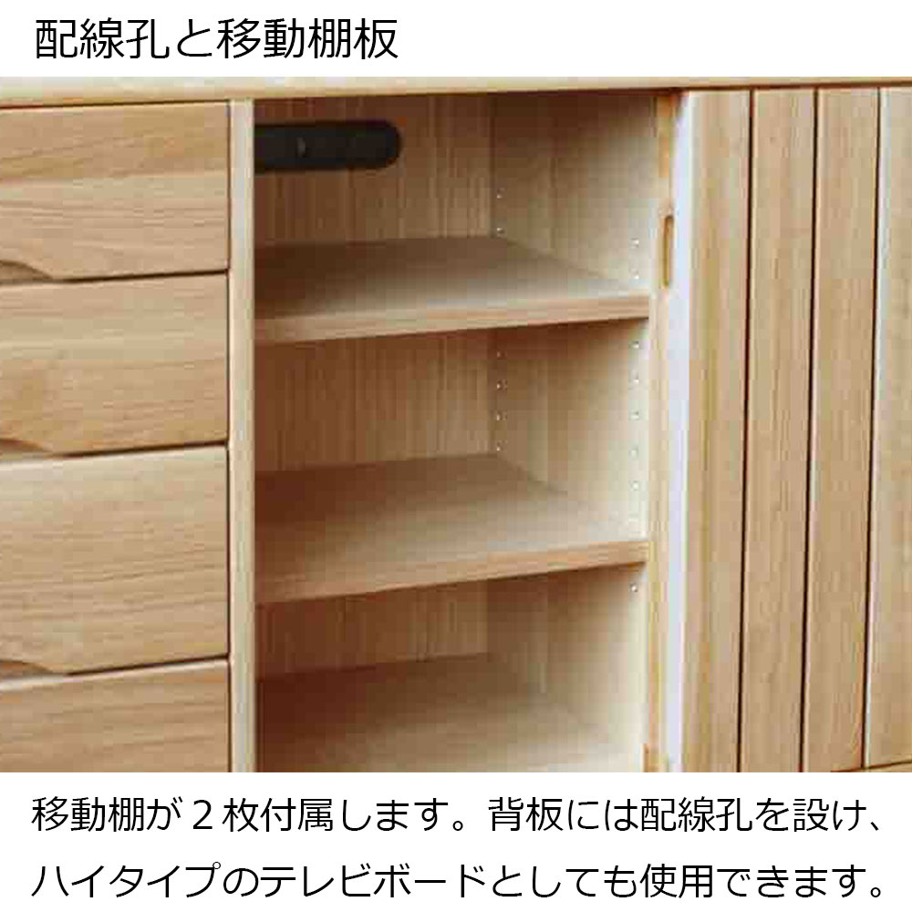 扉内の各スペースには移動棚板が2枚付きます。背板には配線孔を設け、ハイタイプのテレビボードとしても使用できます。