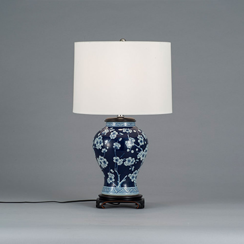 藍色ベースの桜の花模様の入った本体はシノワズリ風のモダンなデザインです。オフホワイト色の布セードとの組み合わせがエレガントさを増しています。心地よい落ち着きのある空間を演出し、やわらかいあかりに心が和みます。オリエンタルでアジアンな雰囲気もありますが、クラッシック・ベーシック・和モダンなど、合わせるテイストによってその表情も変わり、あらゆるテイストに溶け込みます。