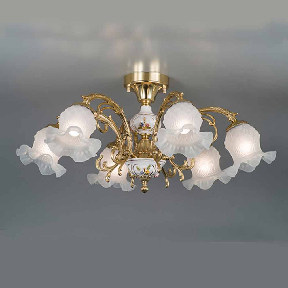 真鍮・陶器・ガラスの組合せが優雅なシャンデリア。