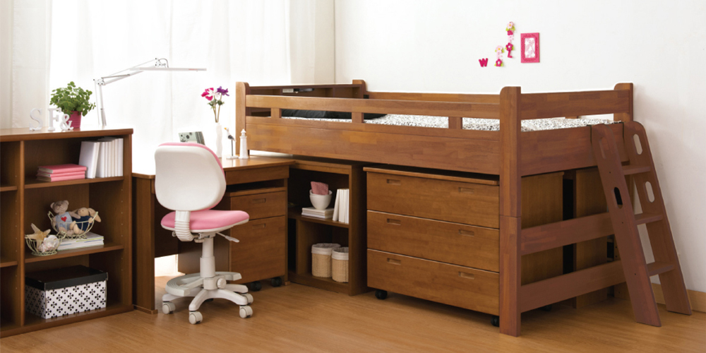 ラークアップシリーズのシステムベッドに収まるサイズに設計されており、空間を有効活用できます。※画像はラークアップシリーズミディアム色のレイアウトイメージです。