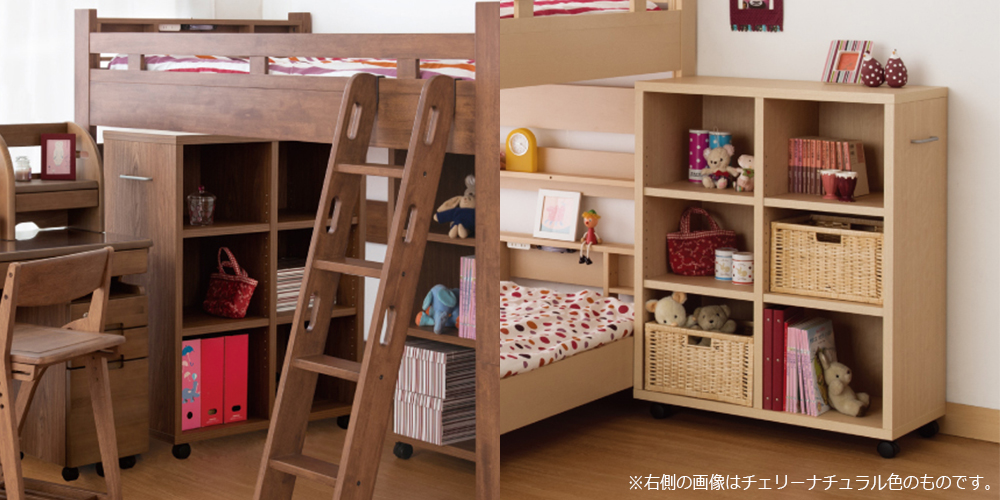 ロフトベッド「アンジュEX」の下にぴったり収まるサイズです。キャスター付きでレイアウトの変更や物の出し入れもしやすい仕様です。※画像はレイアウトイメージです。右側の画像は色違いのチェリーナチュラル色のものです。