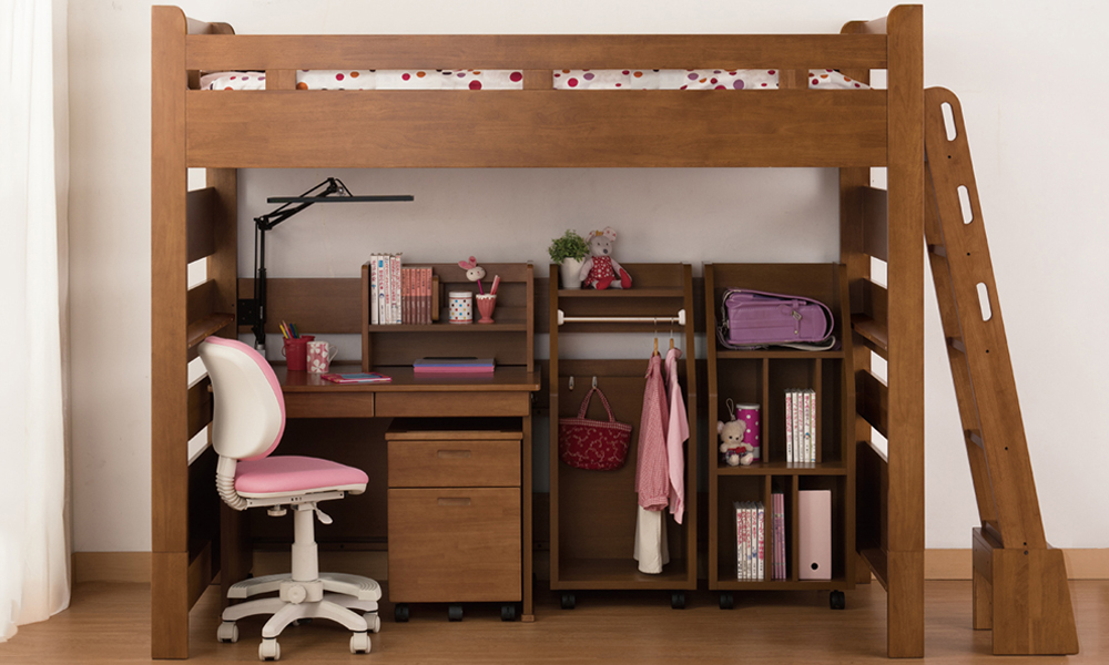 同シリーズのシステムベッドの下に収まるよう設計されており、空間を有効活用した収納スペースの確保が出来ます。※画像はラークアップシリーズのレイアウトイメージです。