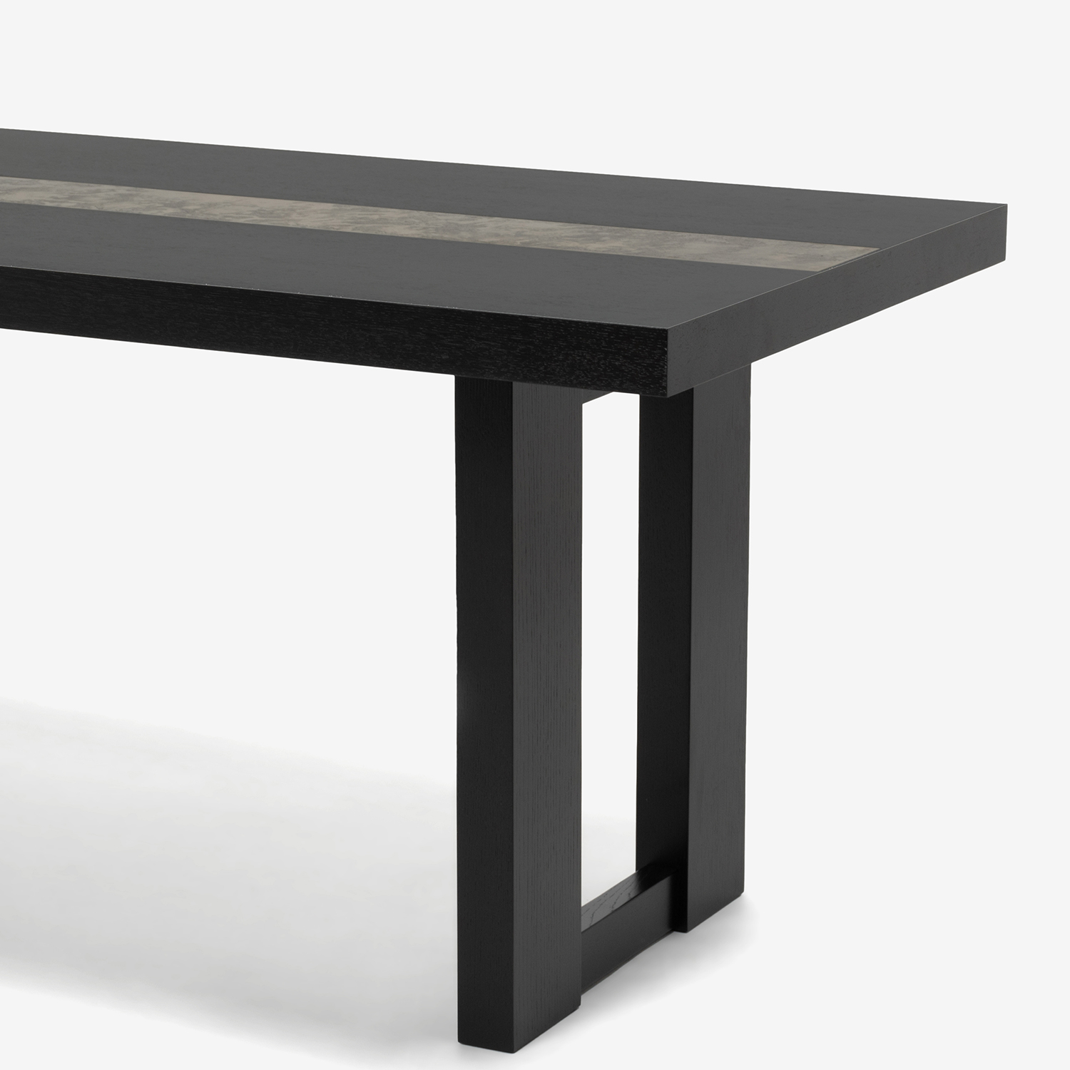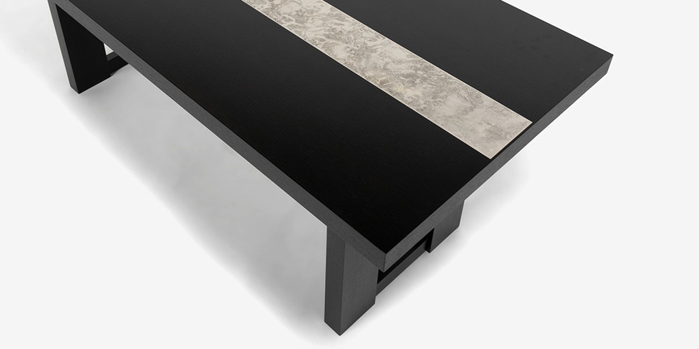 100年以上の歴史を持つ秋田木工のダイニングテーブルに、伝統工芸として名高い高岡銅器をテーブルランナーとしてあしらった、斬新なデザインのダイニングテーブルです。秋田木工の熟練した職人達の手によって、良質の素材から生み出されたダイニングテーブルに、高岡銅器のブランドKANAYAが手掛ける銅板を組み合わせました。この銅板は薬品加工により模様が生まれ、木目の様に1点1点表情が異なり、使い込むほどに変化を楽しんでいただけます。異なるふたつの伝統工芸の技がコラボレートした贅沢なダイニングテーブルです。