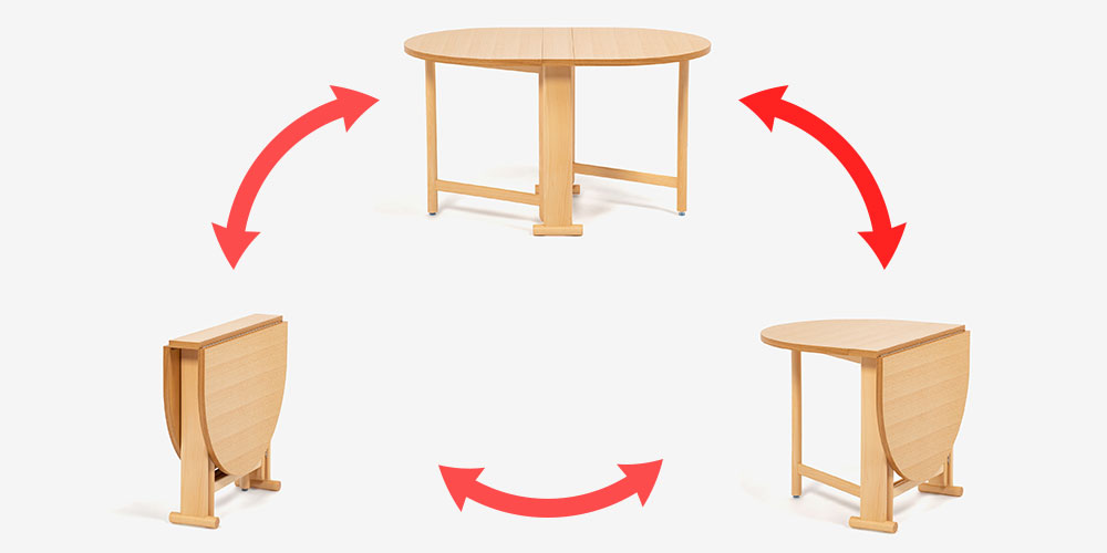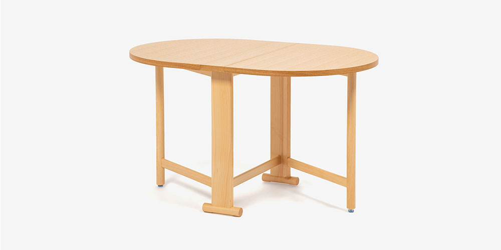 普段はオーバル(楕円)型のやさしい雰囲気のダイニングテーブル。両面たためば収納することもできます。