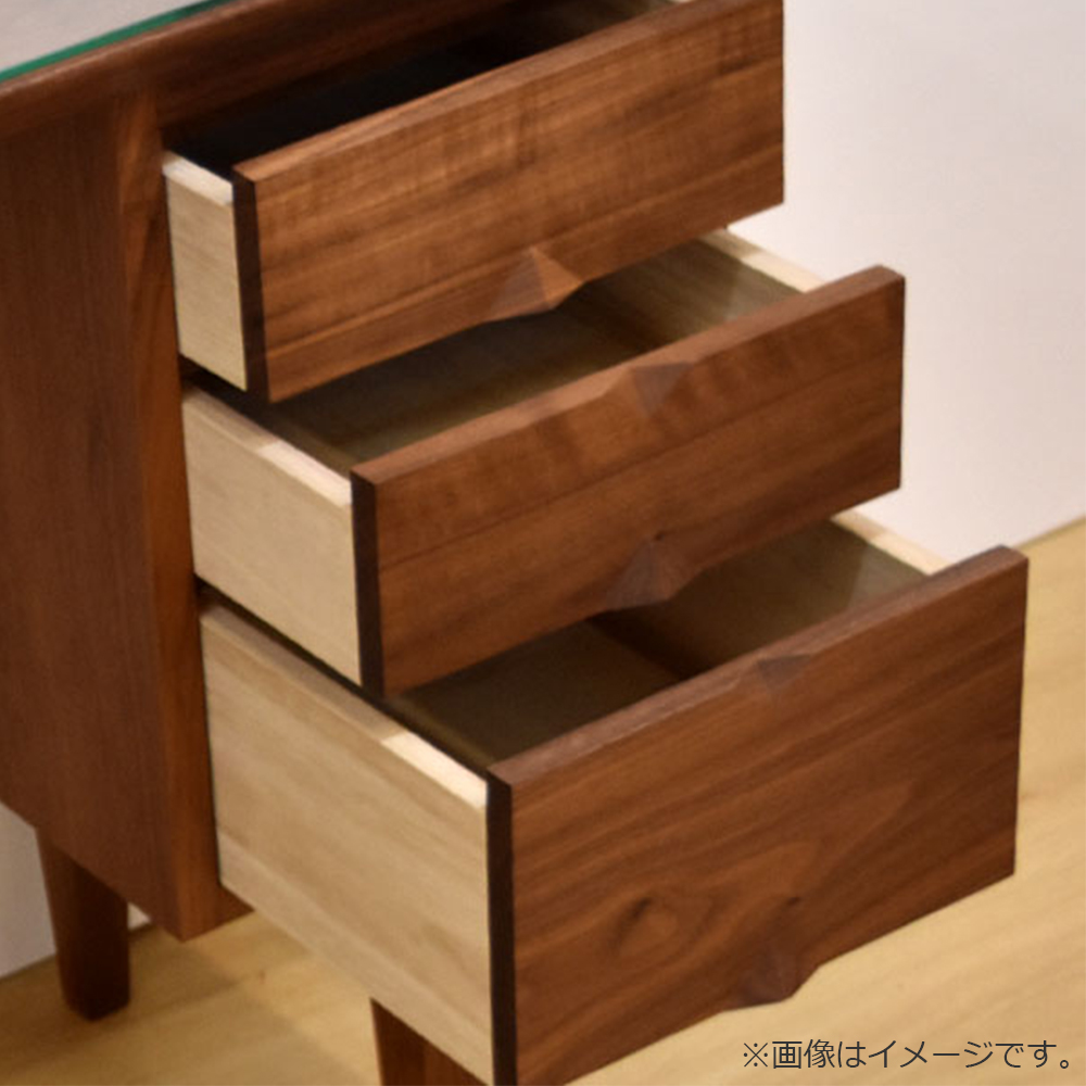ガラス天板タイプは置き鏡をのせて、ドレッサーデスクとしてお使いただけます。引出しのサイズにバリエーションがあることで、コスメの収納にも便利です。