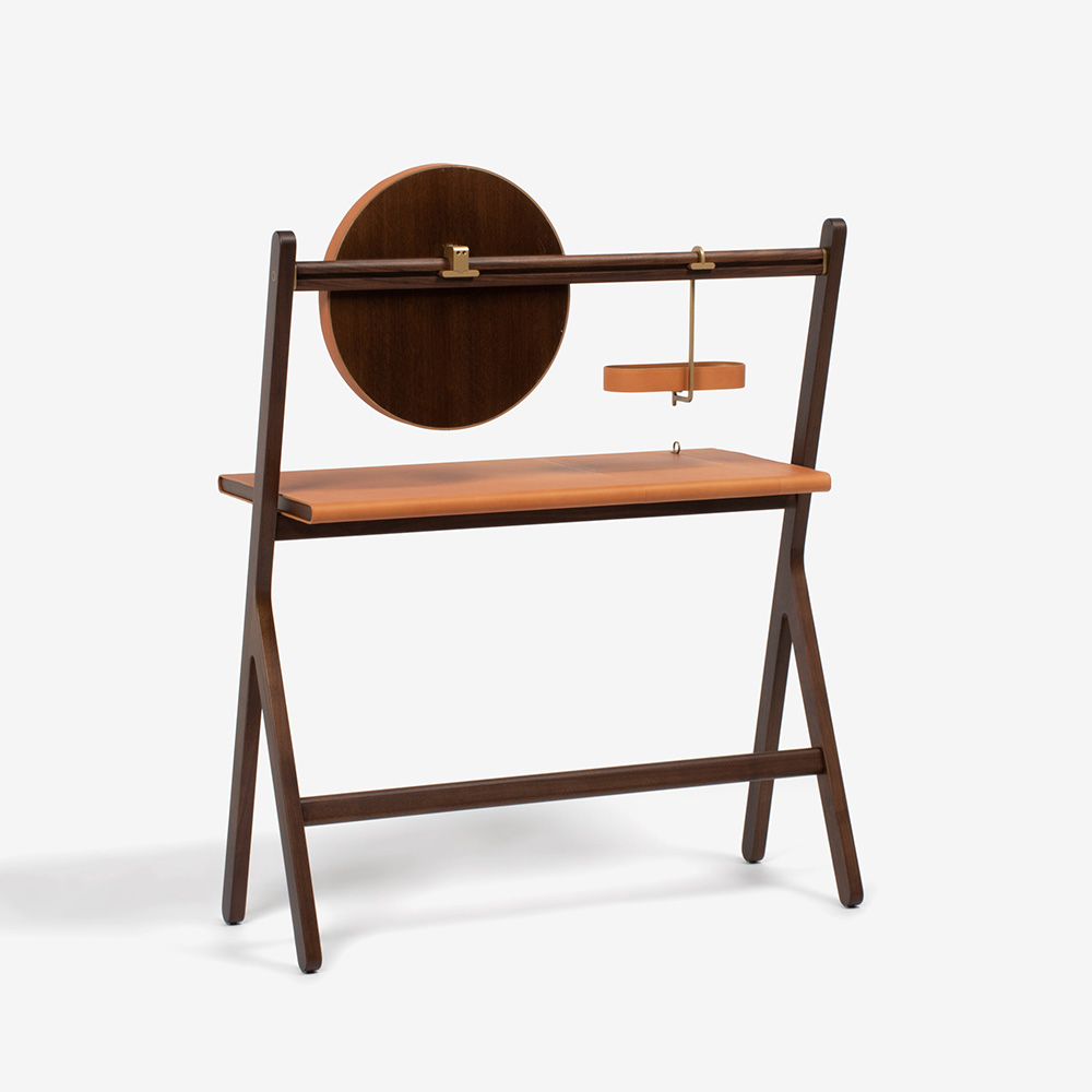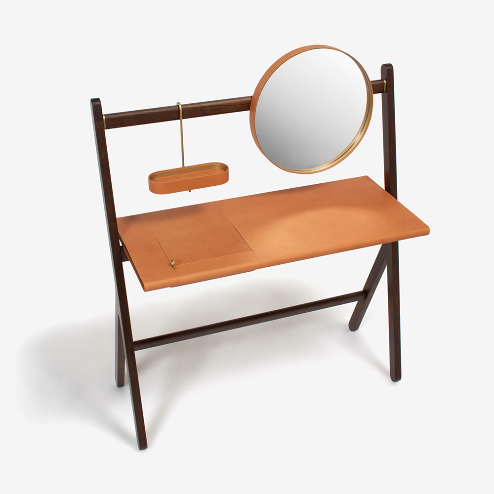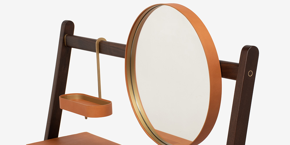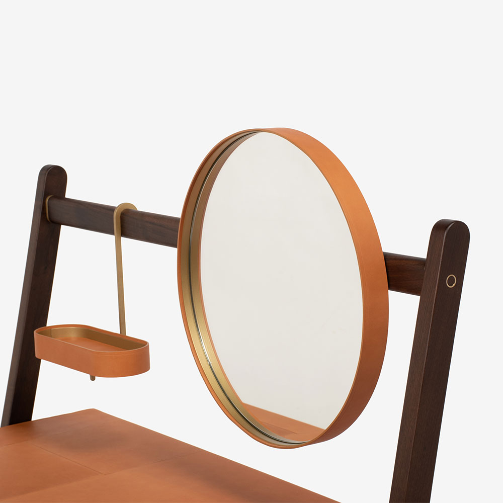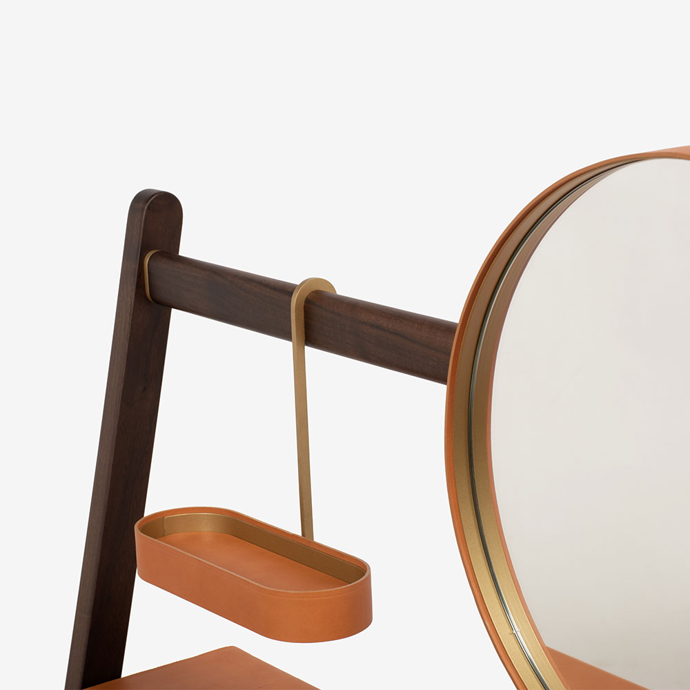 上部の横木にはラウンドミラーと楕円形の多目的トレーがブラス仕上げのフックで取り付けられています。共にウォールナットの突板を使用し、真鍮のフレームにサドルレザーが張られています。