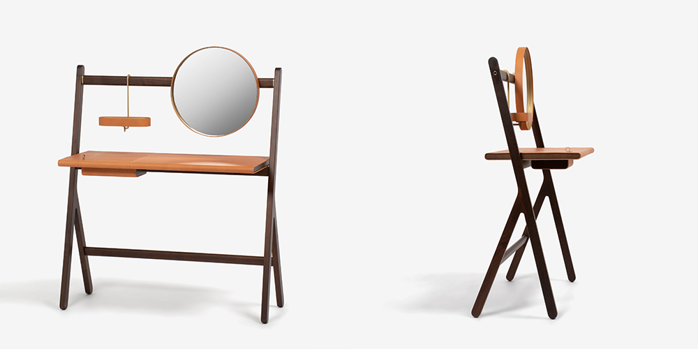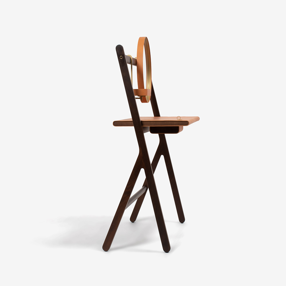 ウォールナット無垢材・真鍮・サドルレザーを用い、丸みのあるフォルムはお部屋のアクセントにもなります。