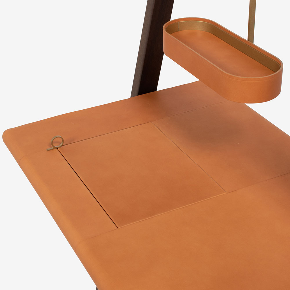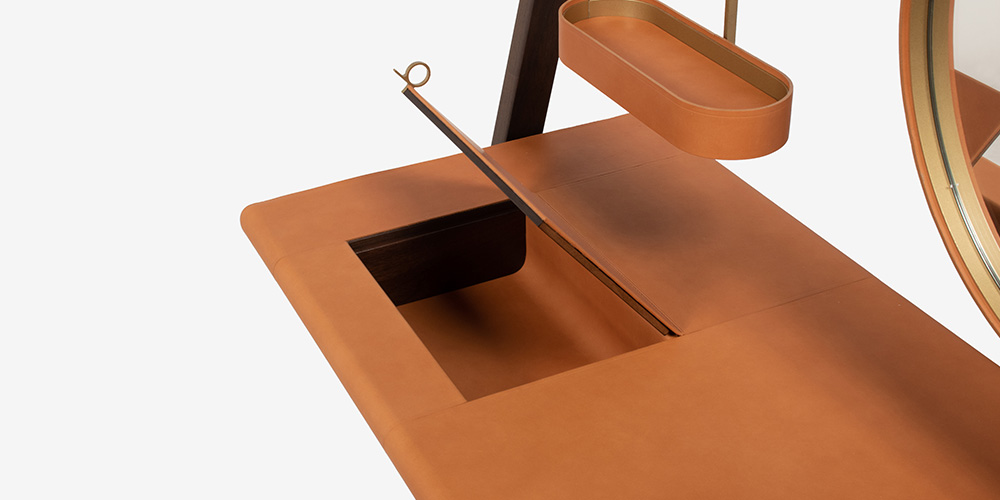 天板にある真鍮製の小さな取っ手を持ち上げると小物入れになっており、アクセサリーやペンなどを収納できます。内部はウォールナットにサドルレザーのマットが敷かれています。