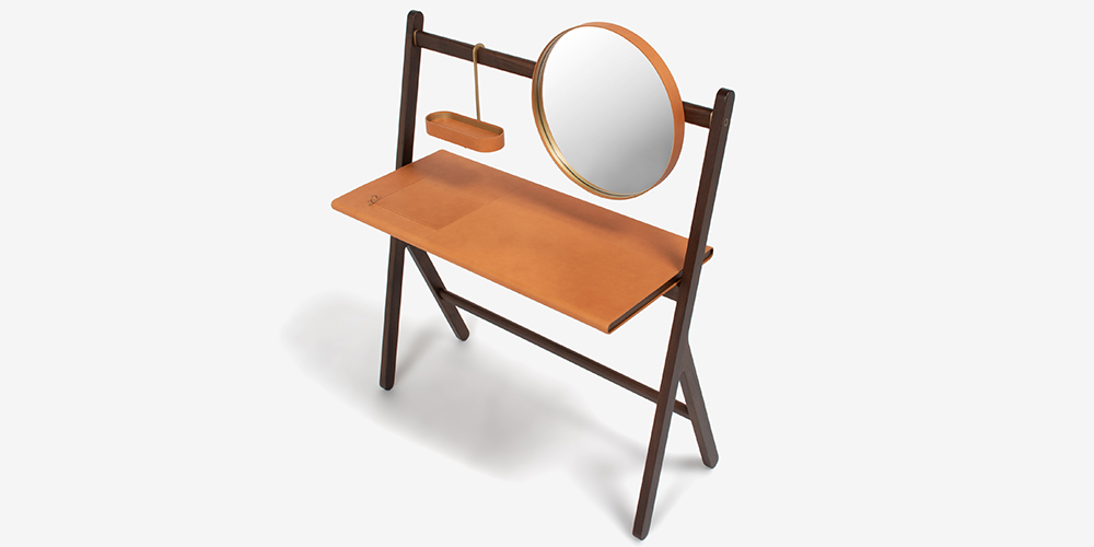 真鍮の形状や、張り込んだサドルレザーなど職人技の「繊細さ」を感じさせるドレッシングテーブルです。