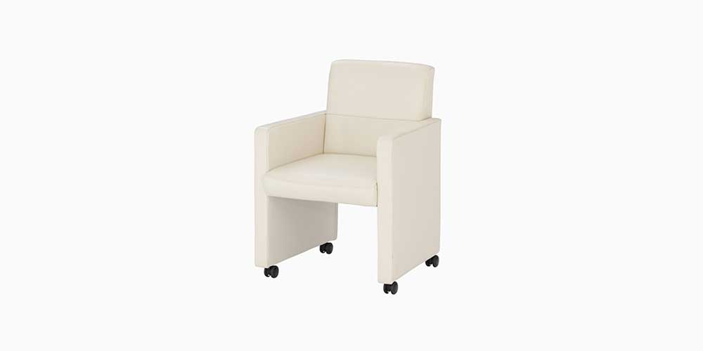 ダイニングテーブルに合わせて使うと、まるでソファに座っているようなくつろぎの空間を作ることができるダイニングチェアです。キャスター付きなので出入りも楽にできます。キャスターは耐油性、耐摩耗性に優れているエラストマー車輪を使用。※画像は#107です。