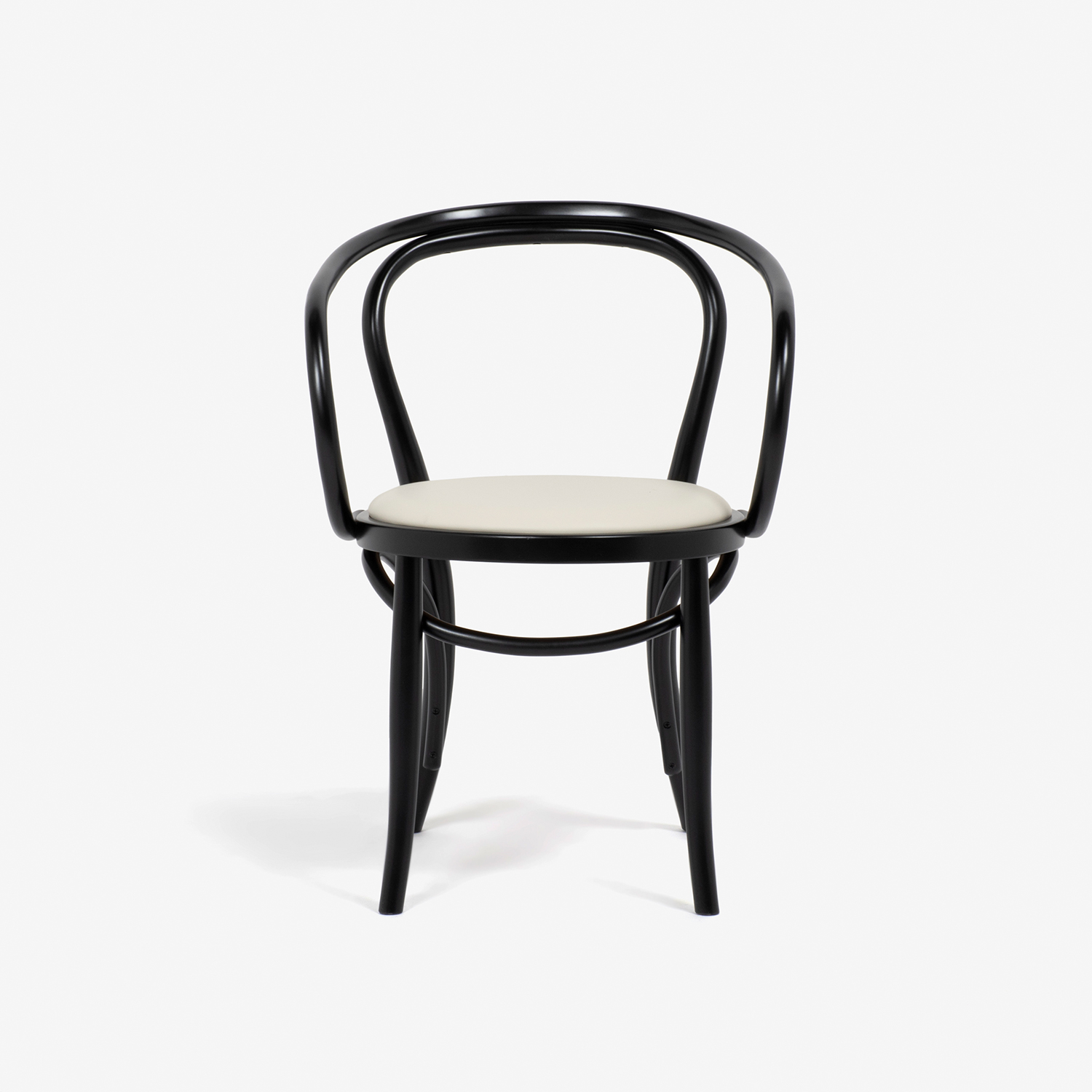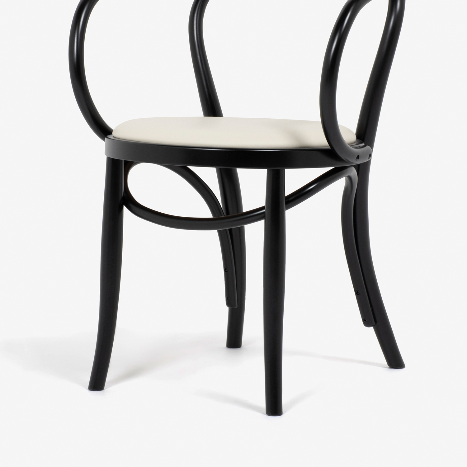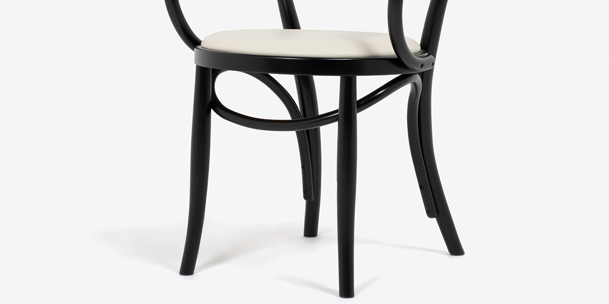 特に前後の脚をつなぐ貫はひねりを加えた曲げを施しており、曲木のなめらかな曲線を印象づけます。