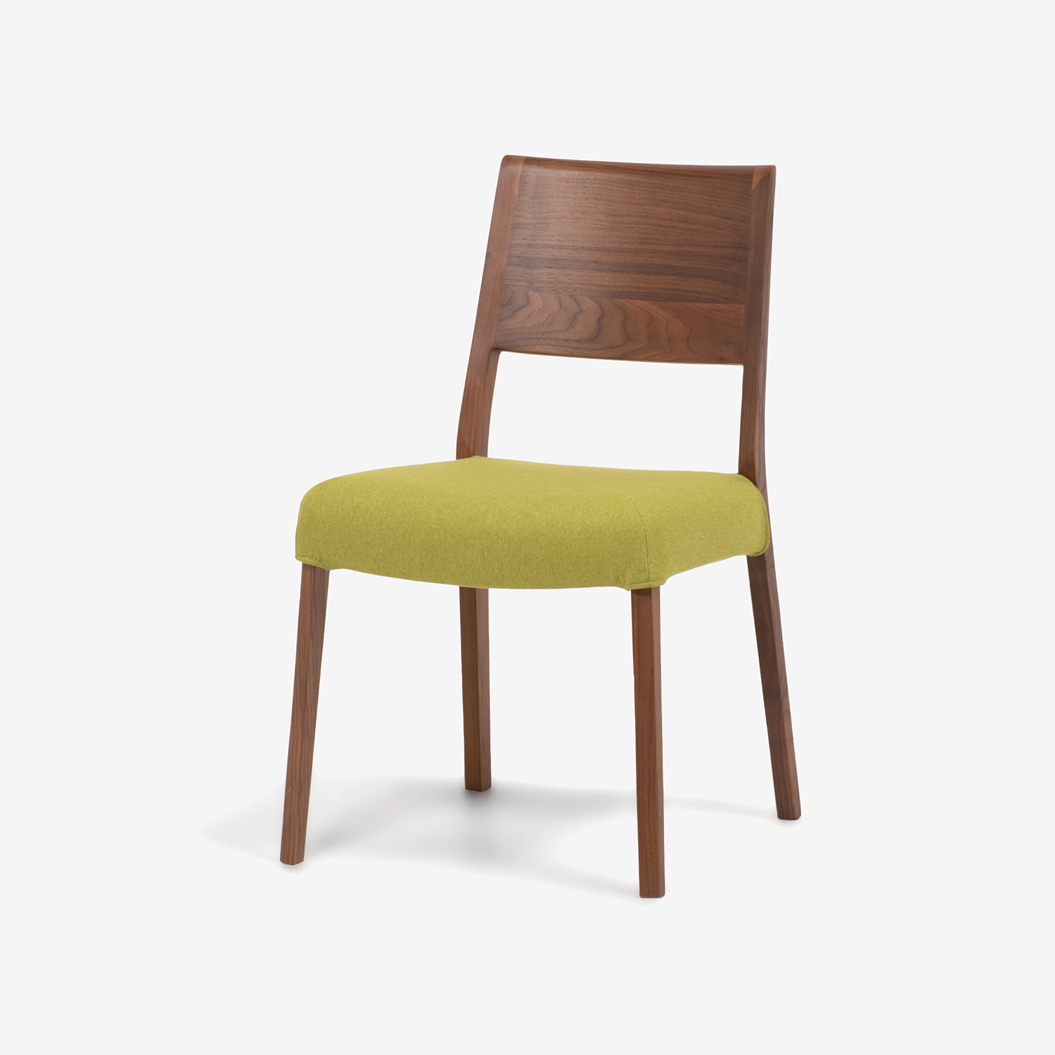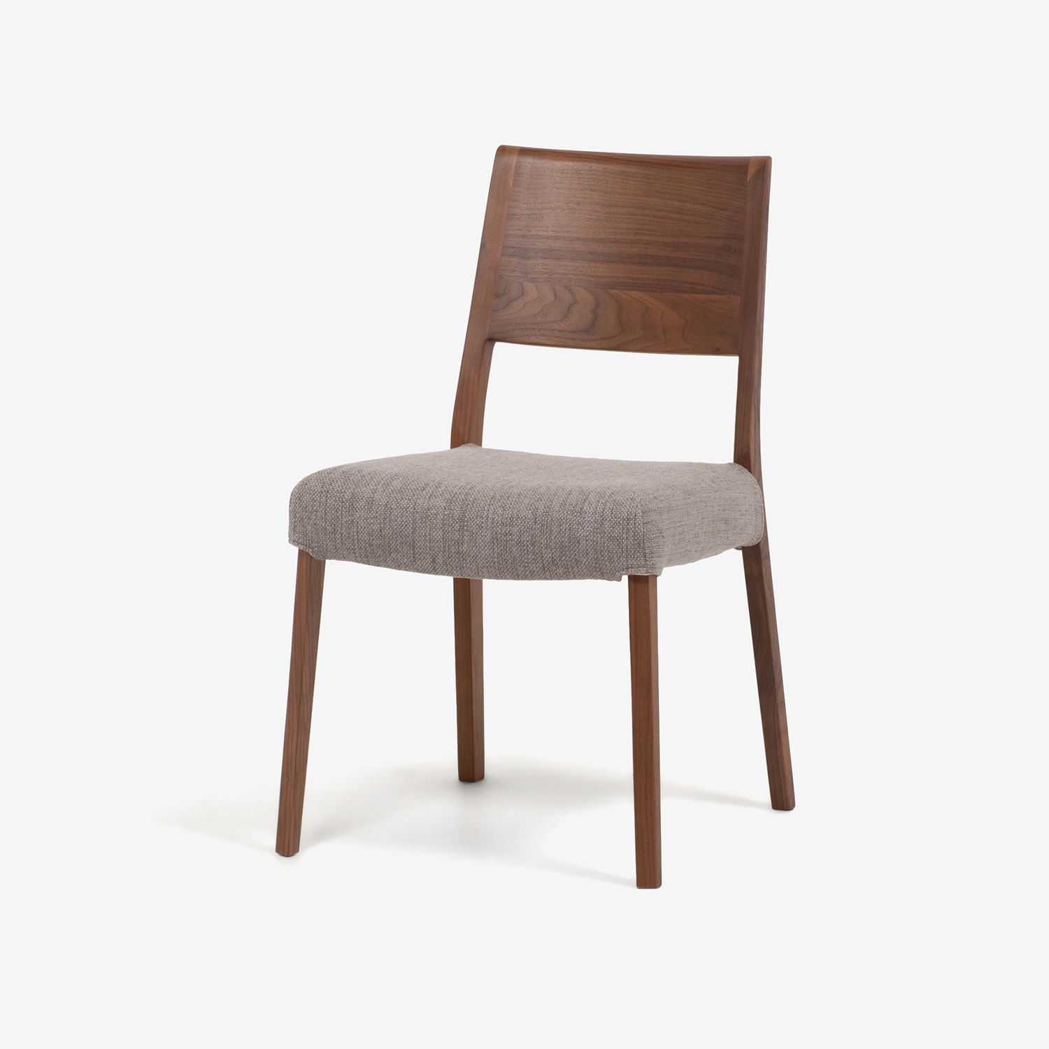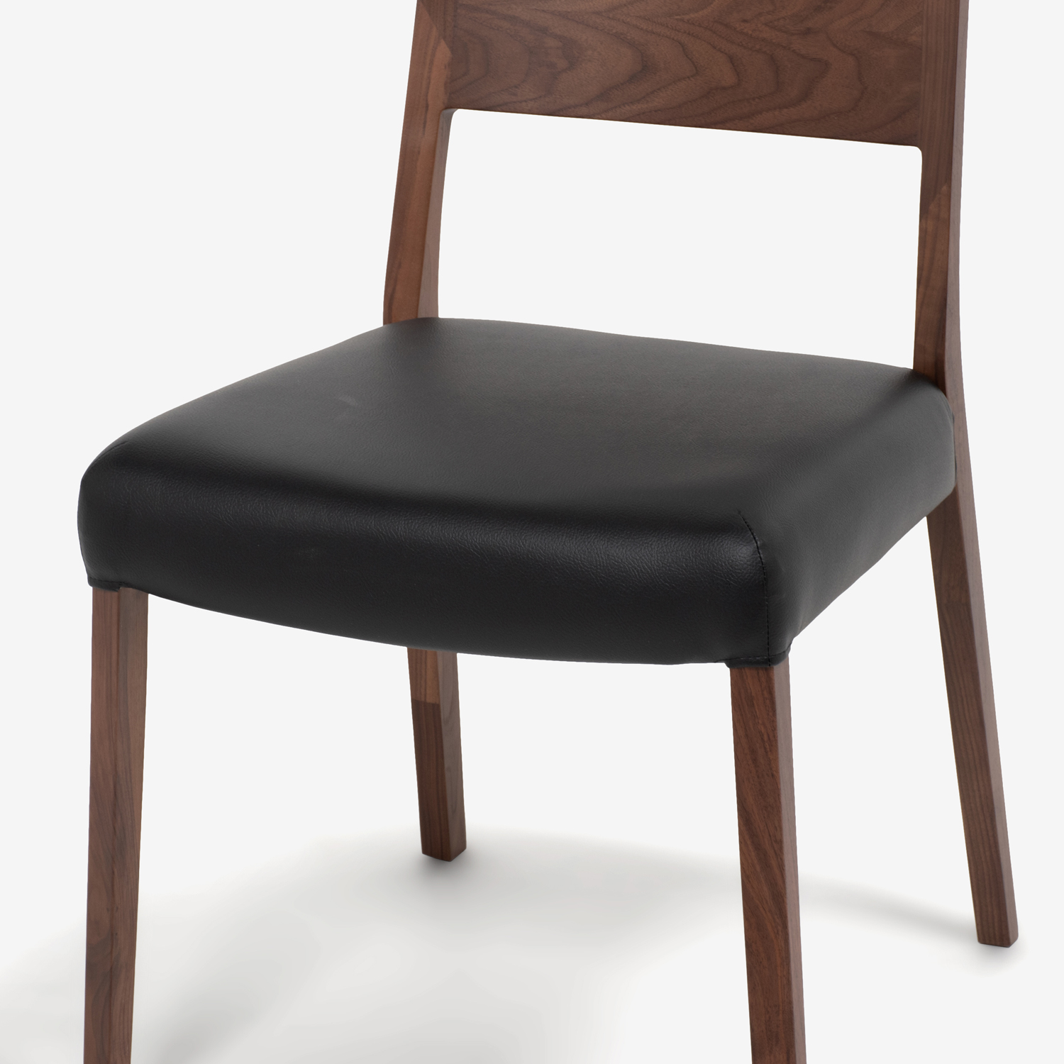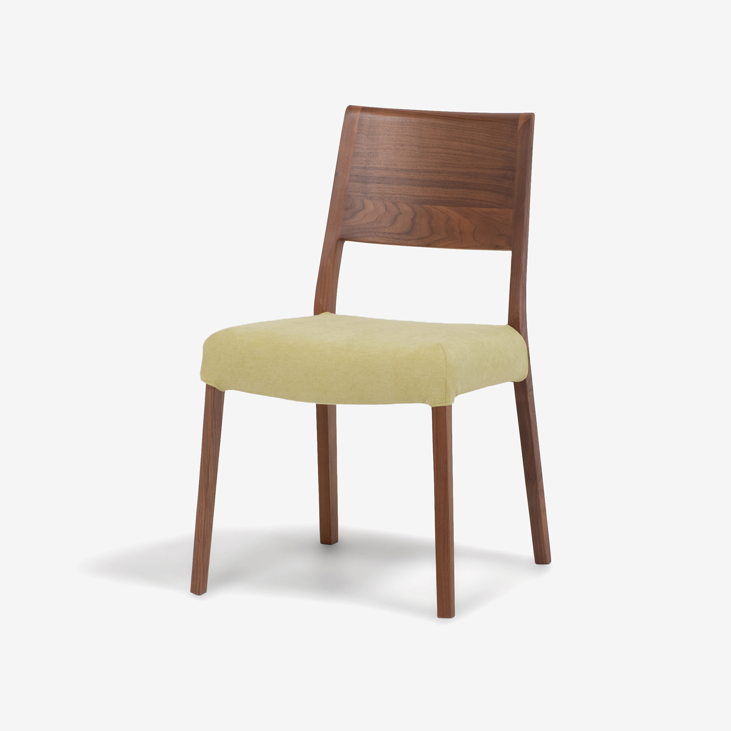 ウォールナット材の無垢材を使用した天然木のあたたかみを感じるカバーリングタイプのダイニングチェアです。座面はPVC素材のブラックとアイボリーの2色から選べ、オプションでPVCの座面の上に布カバーを取り付けることができます。