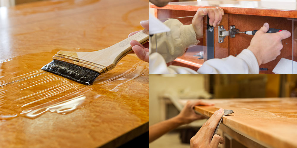 ノミやカンナを使った部材の製造や、釘やネジなどを使わない日本の伝統的な技法である「ほぞ組み」による組み立て、美しく切り出された突板をテーブルに貼る工程や、組み上げた後に丁寧に施される染色など、一つひとつの工程に職人の手技が活かされています。※画像はイメージです。