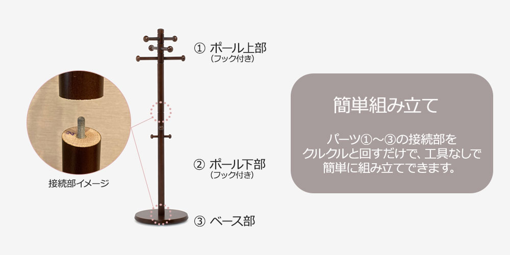 シンプルなブナ材の無垢を使用したコートスタンドは太くしっかりとした安定感があり、木のぬくもりを感じるデザインです。 出番の多い洋服の収納や、見せるディスプレイとして、玄関からリビング、寝室まで幅広くご使用いただけます。