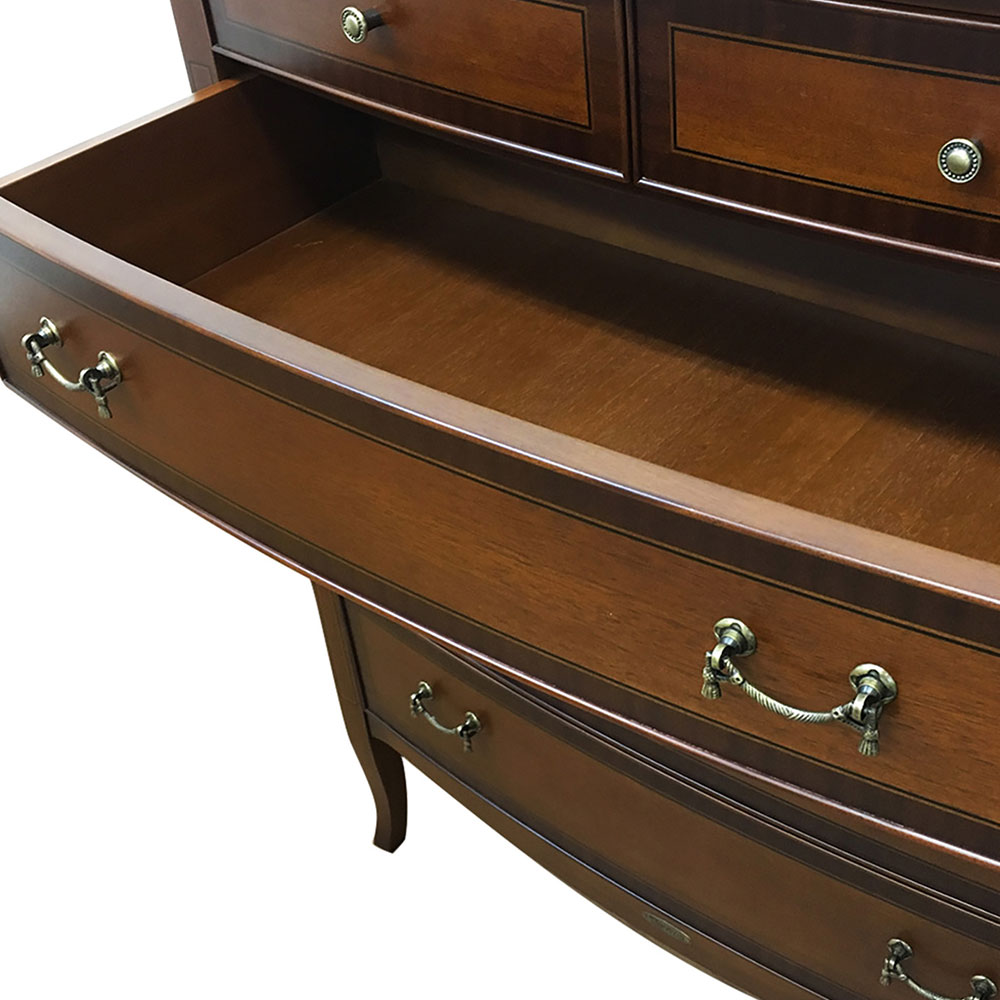 天板と前板の表面にサペリ柾目の模様貼りと、緩やかな曲線ラインが魅力のネオクラシック調のハイチェスト。