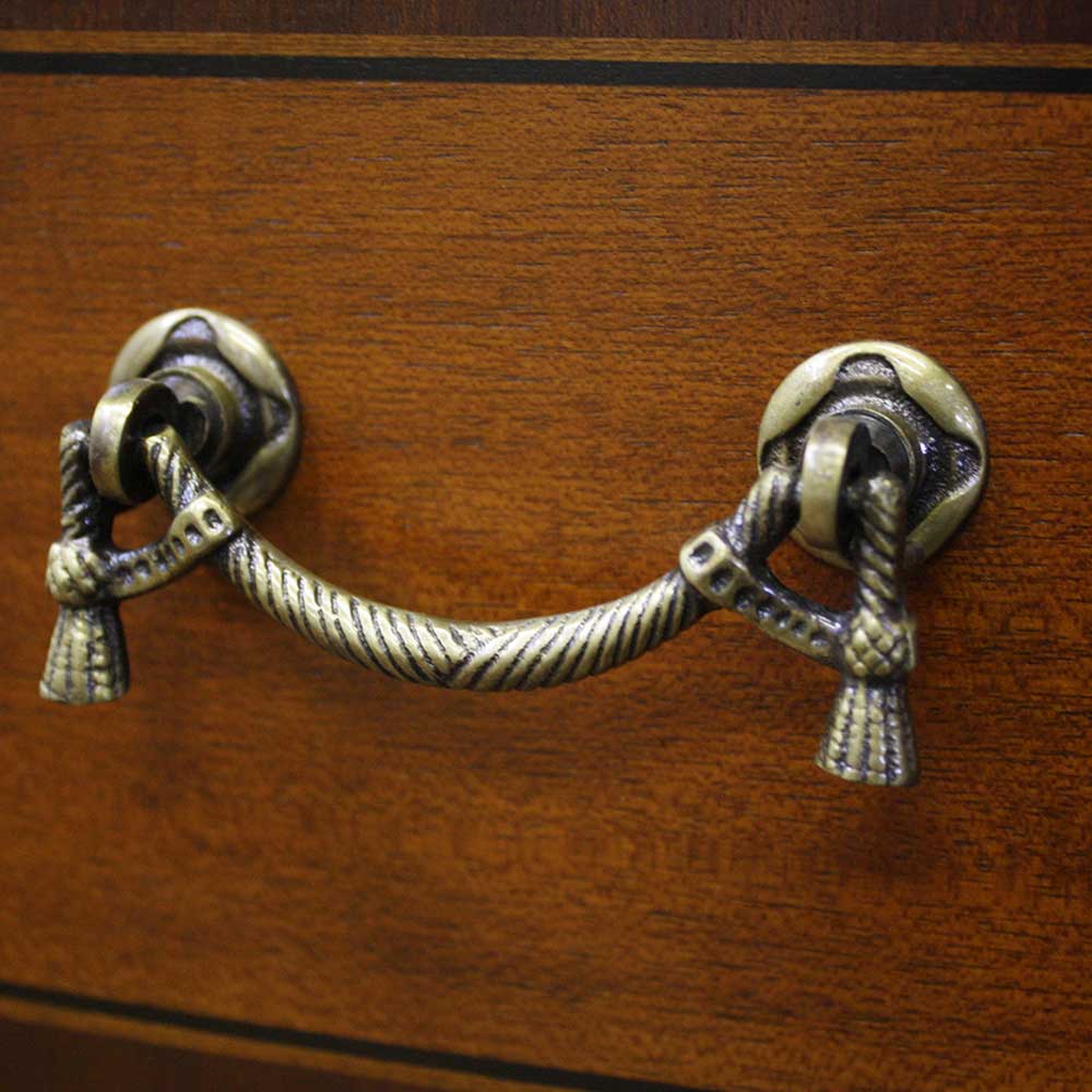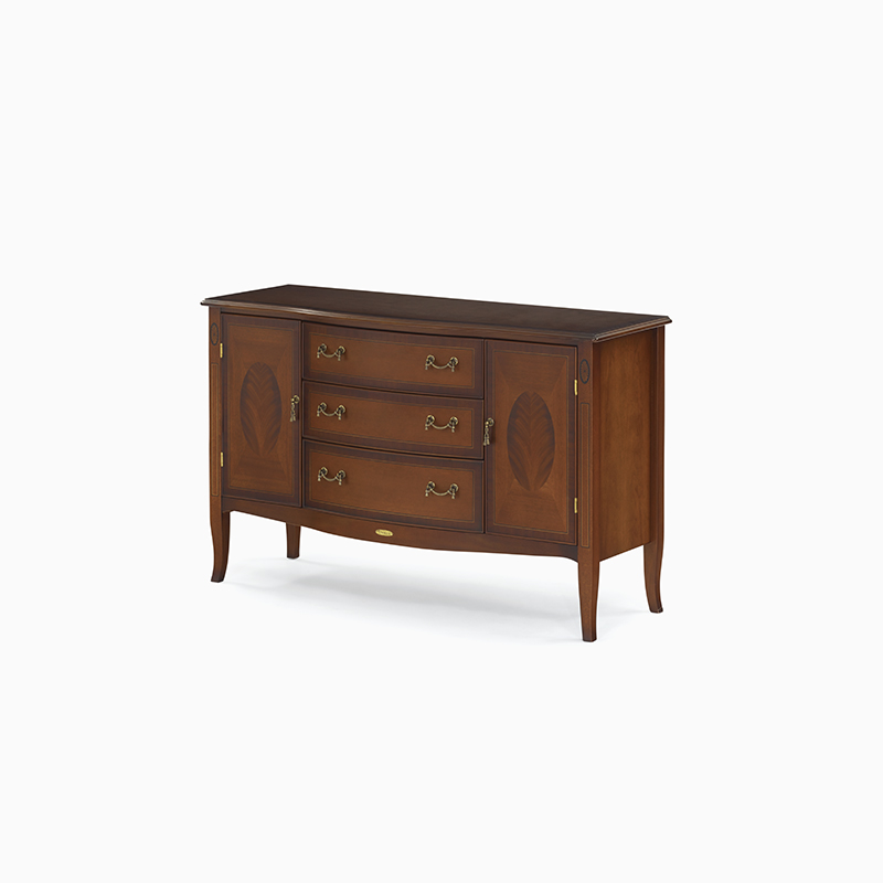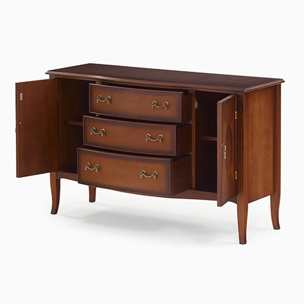 優美な曲線を描くフロントラインが印象的なチェストです。扉部分のクロッチマホガニー(突板)やタッセル風の取っ手など細部までこだわったエレガントなデザインが空間を彩ります。色彩の異なる異種木材を一つ一つ埋め込んで優美な模様に仕上げる細工は、ヨーロッパ家具の伝統ある技法を用いています。