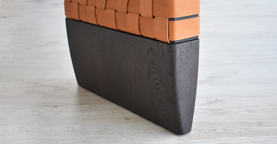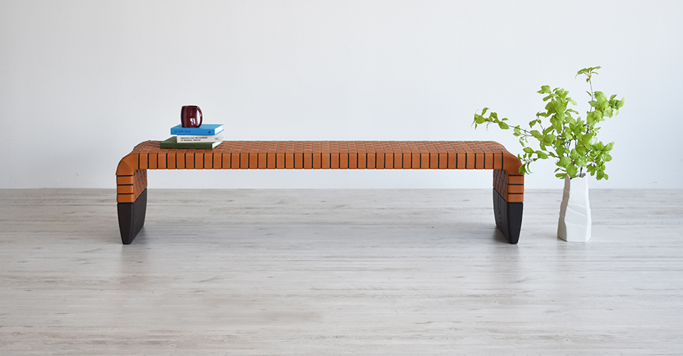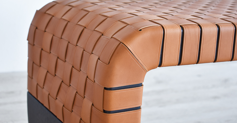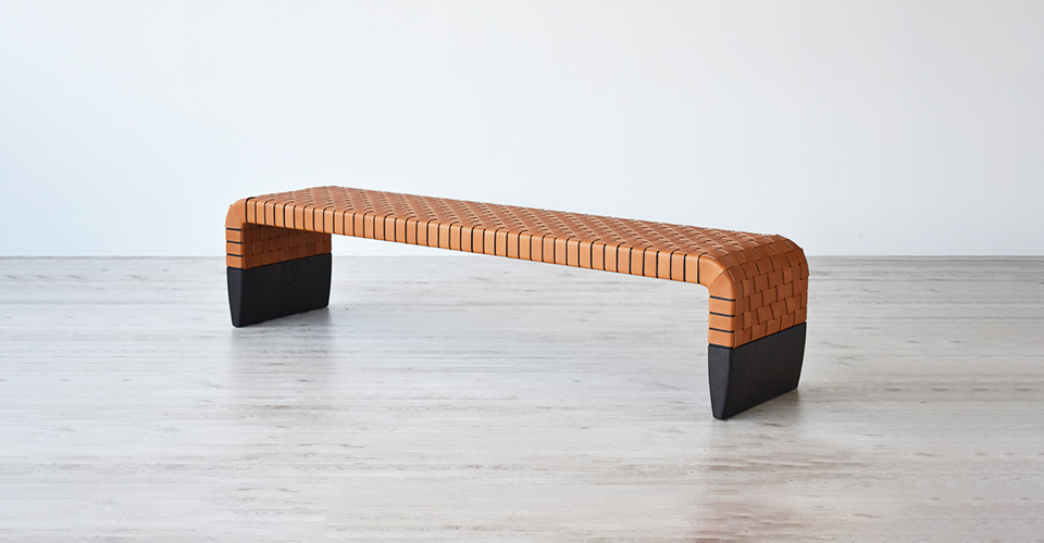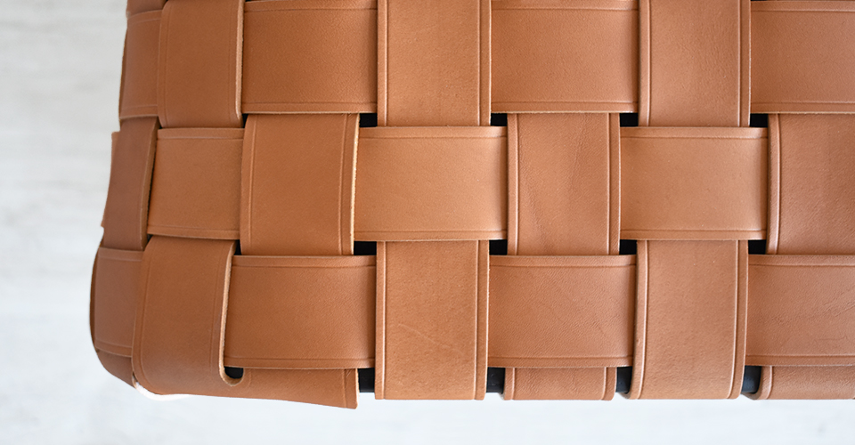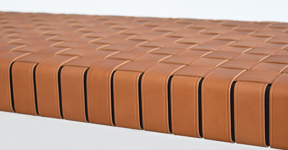 最高級サドルレザーを格子状に編みこんだ美しい佇まいのベンチ「ブレラ」キャメル色