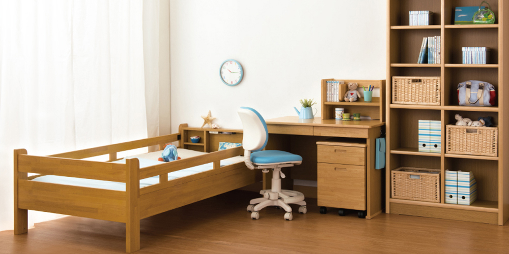 お子様の寝顔が見られる高さのシステムベッドです。ベッド下にはラックやチェストが収まり、収納スペースを確保できます。はしごはステップを広くし、登りやすさにもこだわりました。※画像はレイアウトイメージです。