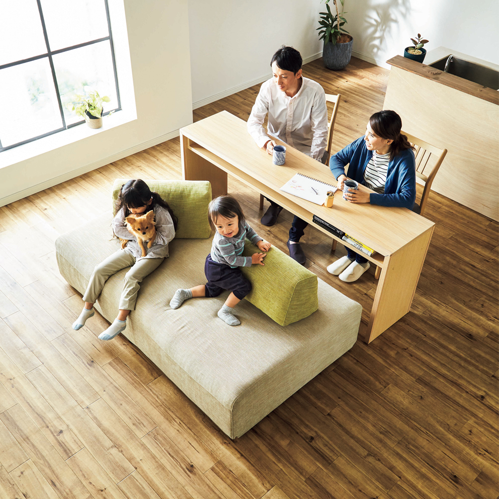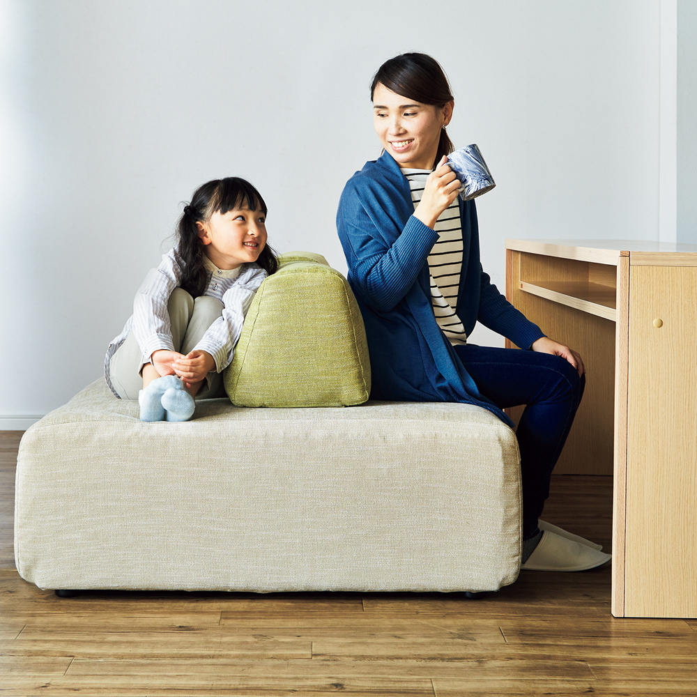 ソファに腰掛けておしゃべりしたり、本を読んだり、寝転んだり、自由度の高い使い勝手のソファです。※テーブルは別売りです。
