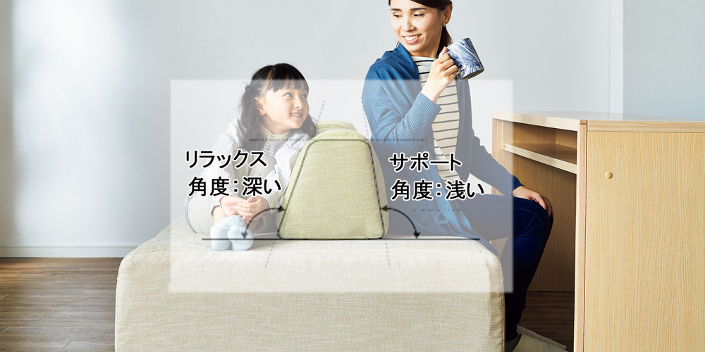 背もたれのクッションは両サイドの角度を変えています。角度の深い方ではゆったりともたれかかってくつろぎ、角度の浅い方ではしっかりと腰をサポートします。※画像はイメージです。