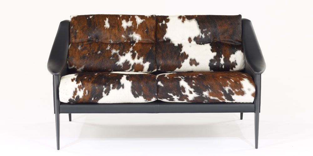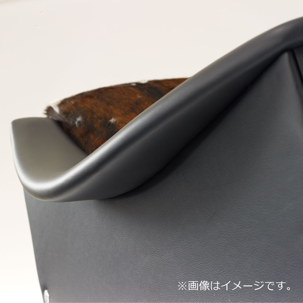 1965年にデザインされ、理想的なモダンデザインとして今もなお人気のアームチェアです。 シンプルなフォルムですが、座と背に個性的な柄のカウスキンを大胆に用いることで、洗練された印象に仕上げています。 側面に打たれた鋲がアクセントとなりデザインを引き締めます。 ※画像はイメージです。カウスキンは自然のものを使用しておりますので、 模様は一点ごとに異なります。