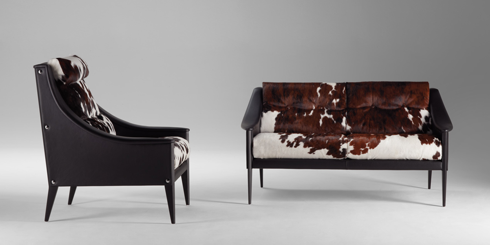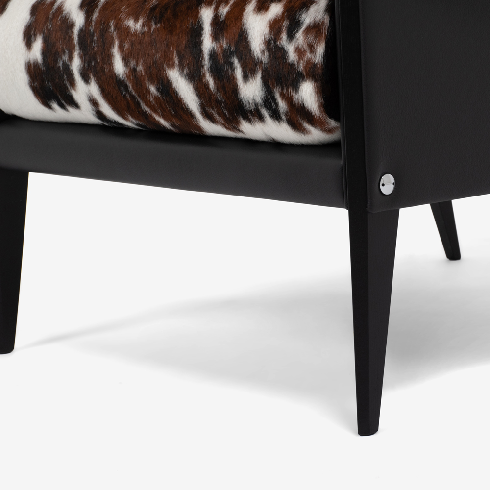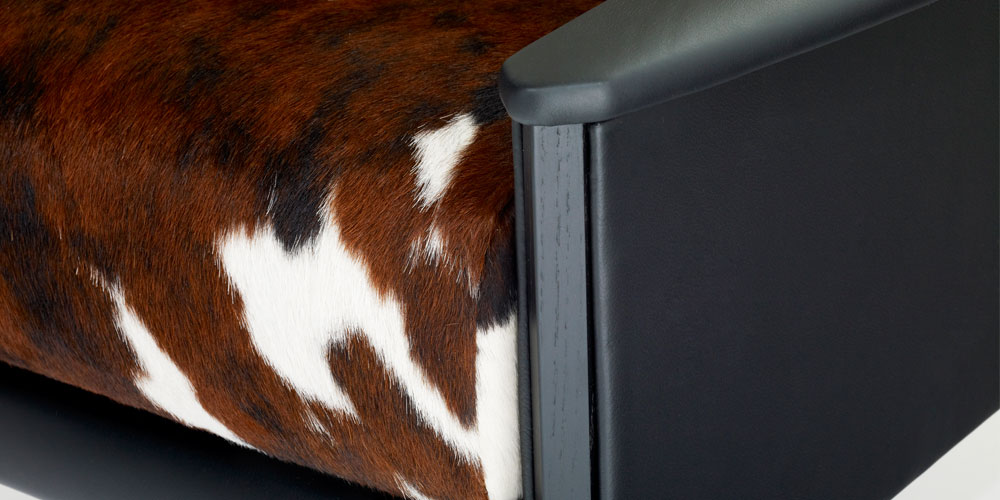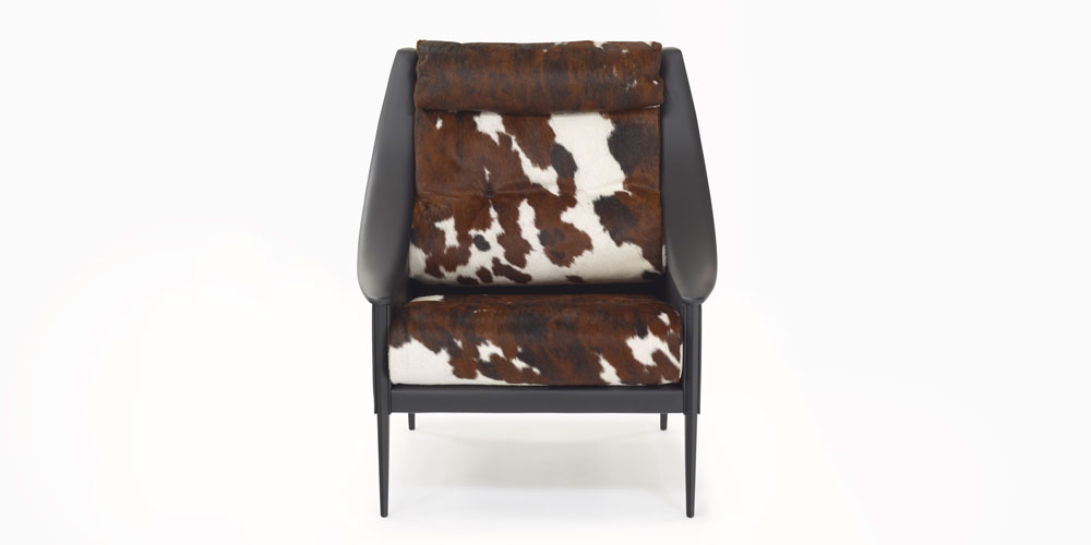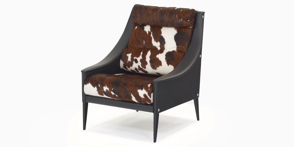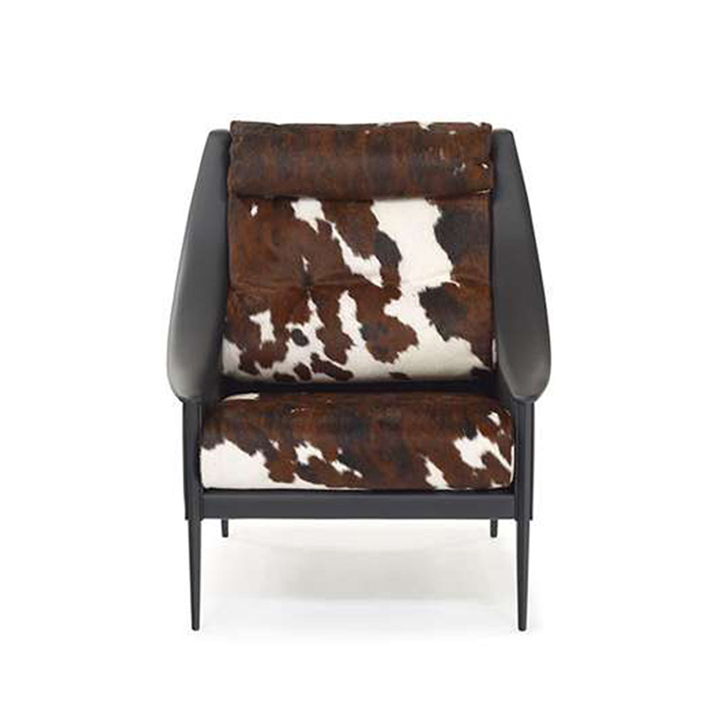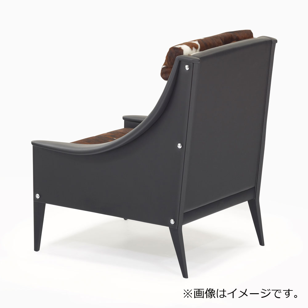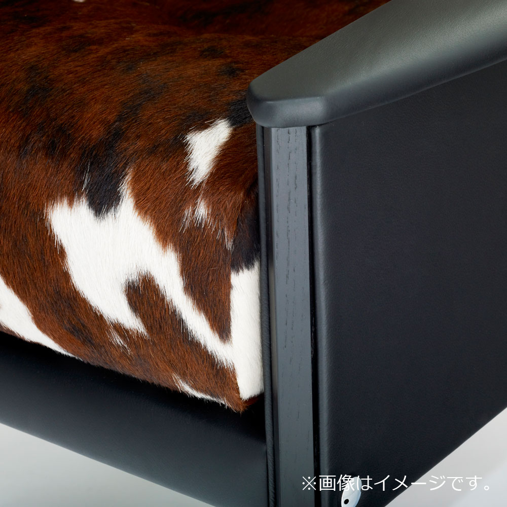 1965年にデザインされ、理想的なモダンデザインとして今もなお人気のアームチェアです。 シンプルなフォルムですが、座と背に個性的な柄のカウスキンを大胆に用いることで、洗練された印象に仕上げています。 側面に打たれた鋲がアクセントとなりデザインを引き締めます。 ※画像はイメージです。カウスキンは自然のものを使用しておりますので、 模様は一点ごとに異なります。