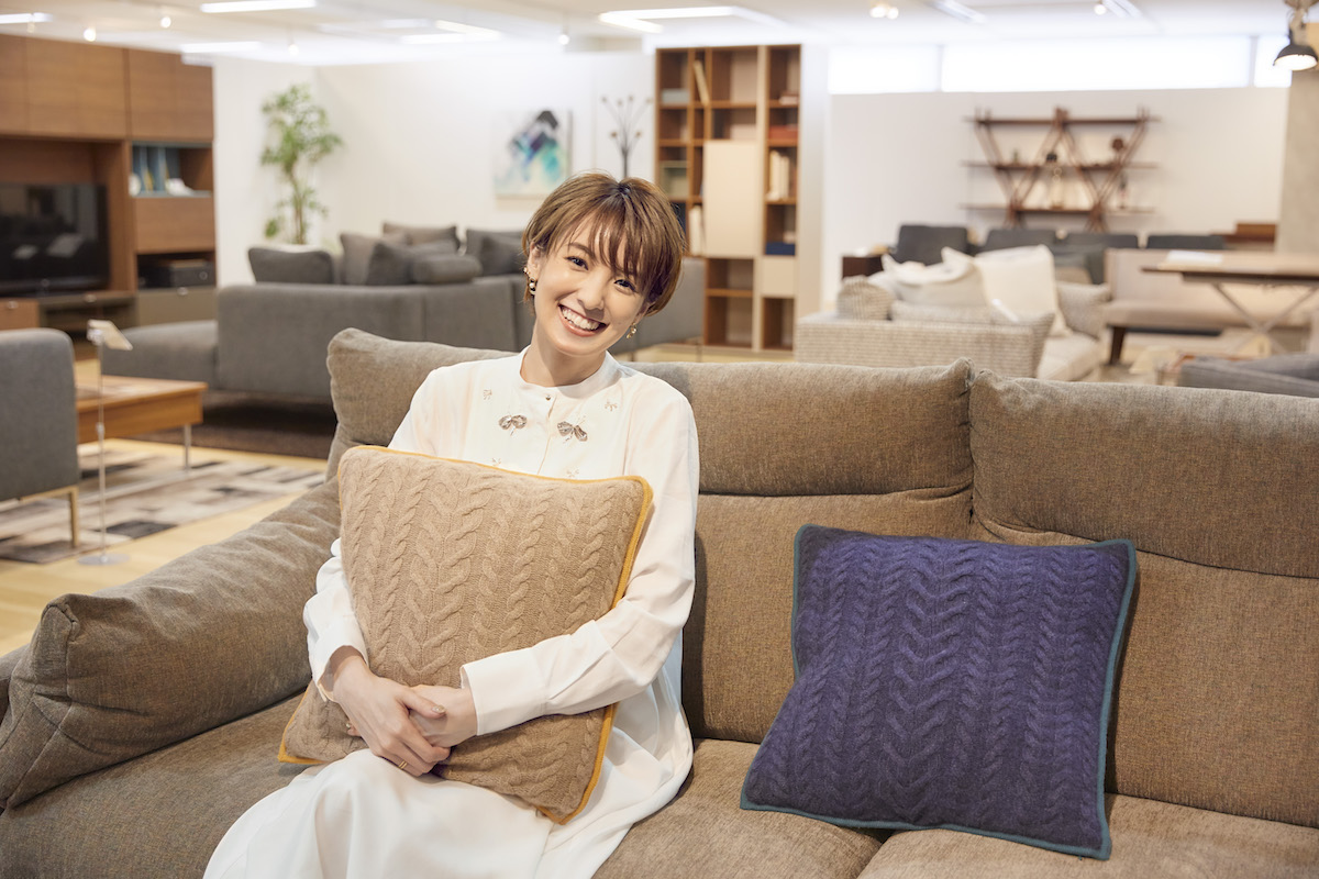 私は、おうちの中を”くつろげるかどうか”をとても重視しています。なので、安心感があるインテリアを選んでいきたいんです。同じものを長く使っていきたいけれど、小物を変えることで衣替えをしていくのも楽しそう。インテリアも季節に合わせてファブリックを変えると温かさが出て、同じ部屋でも全然印象が違いますよね? リビングのソファは、落ち着いたネイビーのものを使っているので、それに合わせてクッションやブランケットを冬物で合わせたいな。