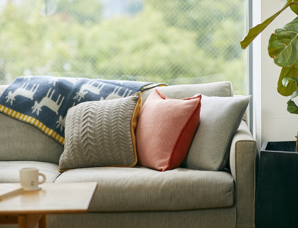 寒暖の差が激しい西モンゴルで育った細くて柔らかい毛質のホワイトカシミアを100%使用したクッションカバー。はじめて触った時にその柔らかさに驚いた南さん。「カバーを変えるだけで、同じソファでも印象がガラリと変わりますね!手触りがいいから、ずっと撫でていたくなる〜!」おうち時間をもっと心地よくしてくれるアイテム。