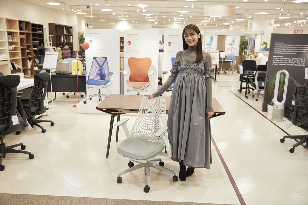 独特なデザインが目を引く、ハーマンミラーの「セイルチェア」。吊り橋の原理を応用してつくられた樹脂製の背もたれは、場所によって編み目の太さを変えることで体を快適にサポートします。デスクワーク中は前傾姿勢になりがちですが、セイルチェアは背座が前掲するので骨盤が立ち、正しい姿勢をとることができます。