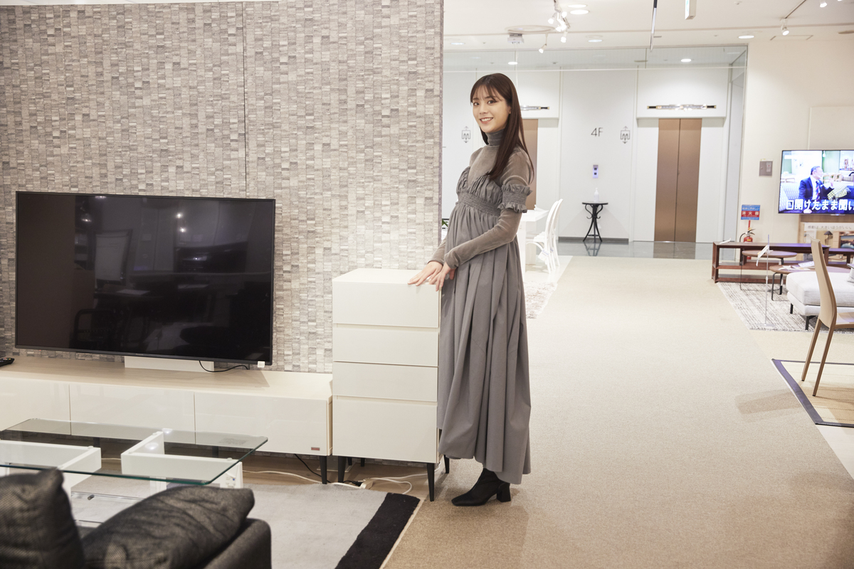 おもむろに引き出しを開けて、サイズ感を気にし始めた貴島さん。ホワイト色のガラスの内側に白木調の木目シートが貼られたスタイリッシュなチェストは、ゲームソフトを入れるチェストとして気になったようです。引出し前板に使用している立体特殊印刷ガラスが、照明に照らされることにより煌びやかな表情で空間を演出します。