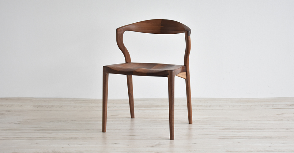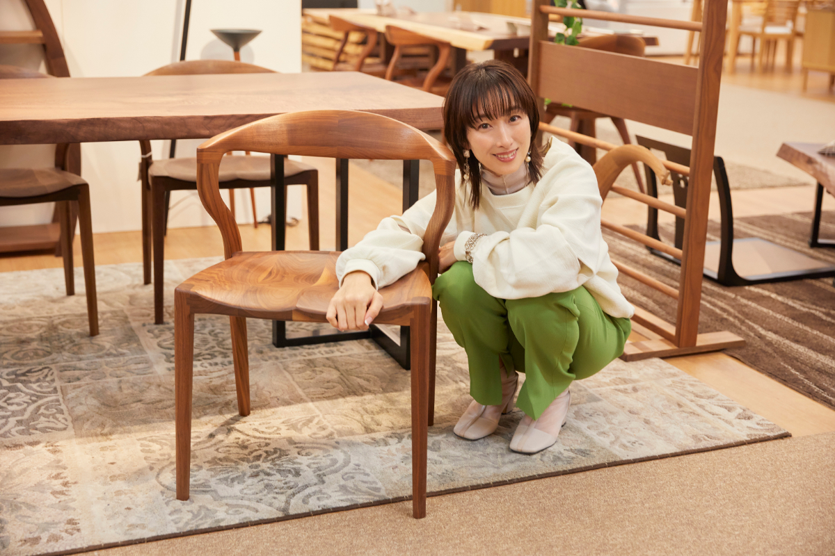 「座った瞬間に、もうお尻が他と違う!って言ってます」と坂下さんが大絶賛したダイニングチェア「カムイ」。ウォールナットを使用している点も坂下さん的ヒットポイント。質感も上質で、座りながらその滑らかさを何度も確認していました。ぴったりとしたフィット感は、長時間デスクに向かっても疲れにくい構造になっている証拠です。