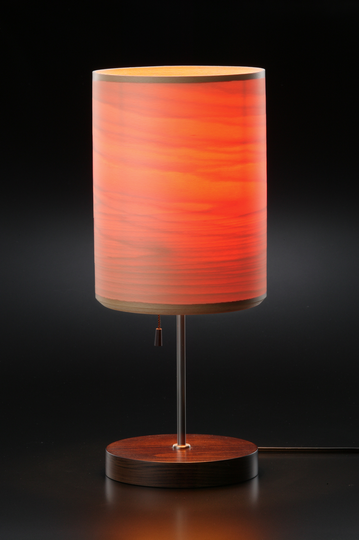 テープ状のブナ材を巻きつけ成型したものとスライスしたものを組み合わせることで生まれたBUNACOの照明。光を透過させた際の赤い光が木目によって一つひとつ違う印象を与える。日中は美しい白木の出で立ちですが、夜をあかり灯すと、シェードの木目模様は紅く浮かび上がり、幻想的な空間を演出。ブナ材の自然の色合いと、ブナコ特有の質感が魅力。