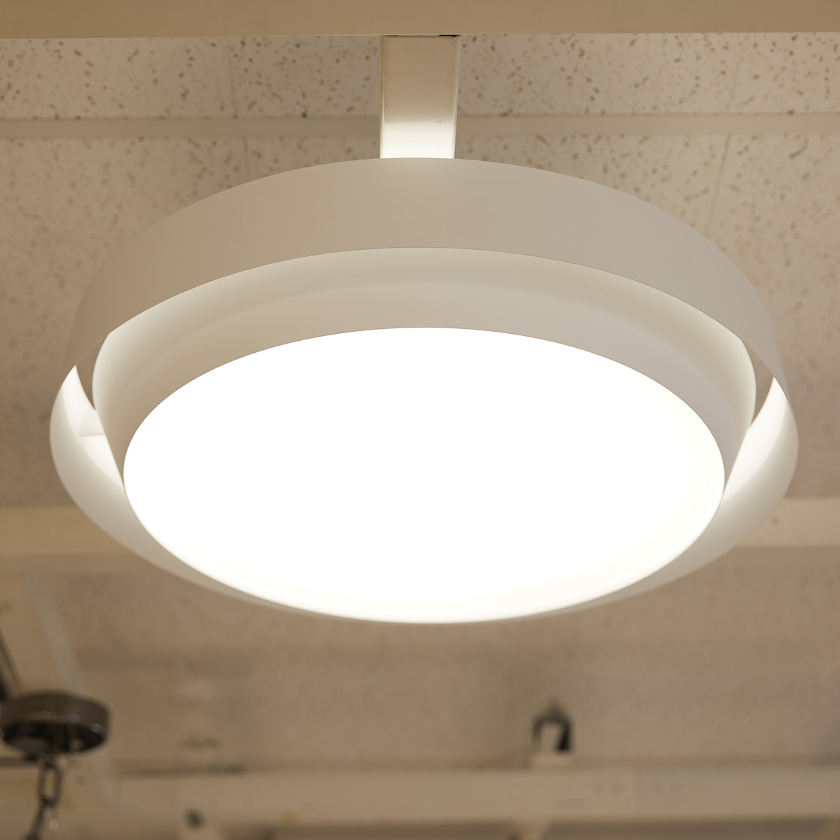 フランス語で「円(サークル)」の意味を持つセルクルは、真っ白でシンプルなフォルムでありながら、光と影の表情を巧みに計算して設計されたシーリングライト。直下方向への光は、高拡散の乳半マットアクリル製のディフューザーを通して明るく均一に拡がり、また、角度の異なる二重のフードは側面に拡がる光を受け、美しいグラデーションを描く。
