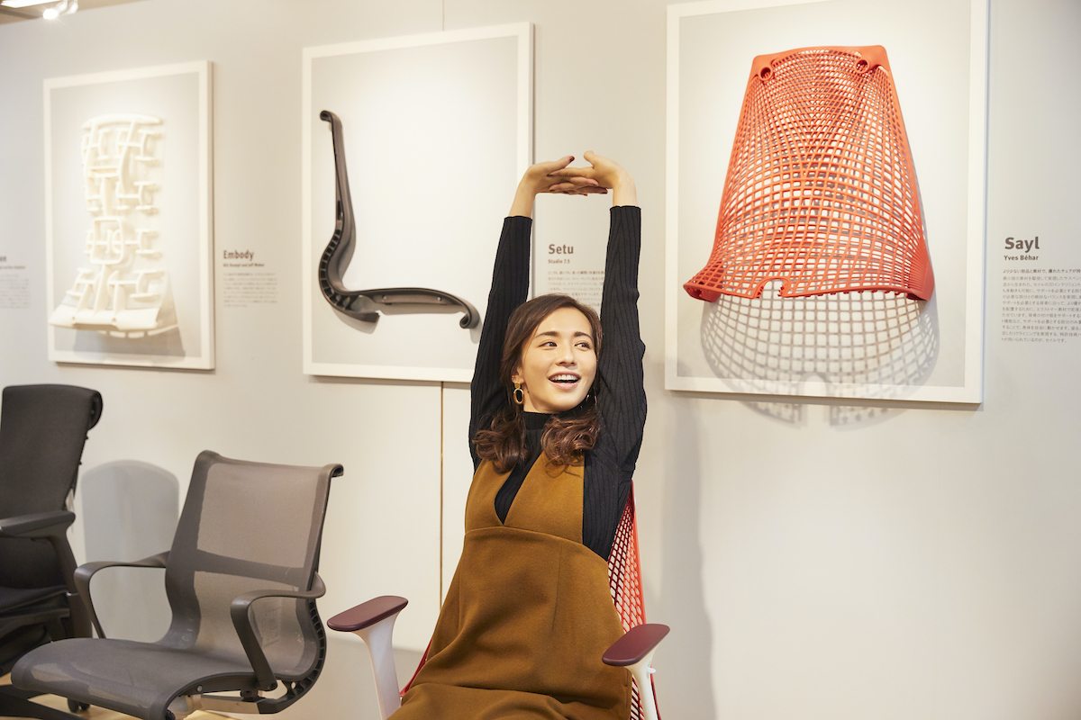優木さんが座って驚いたのは、身体をしっかり受け止めてくれる背中部分。吊り橋の原理をもつフレームのない全面サスペンションで、体を快適にサポートしてくれる独創的なチェア。「座りっぱなしもよくないので、時々ストレッチをするんですが、座りながら動いても平気!」と何度もサスペンションを確認。実は、新しい生き方、働き方が求められる現代の環境に合わせて開発されたもの。まさに在宅ワークをサポートしてくれるアイテム! HermanMillerを代表する前傾チルト機能等の9つの機能を搭載し、高機能かつコスパ抜群のチェアです。