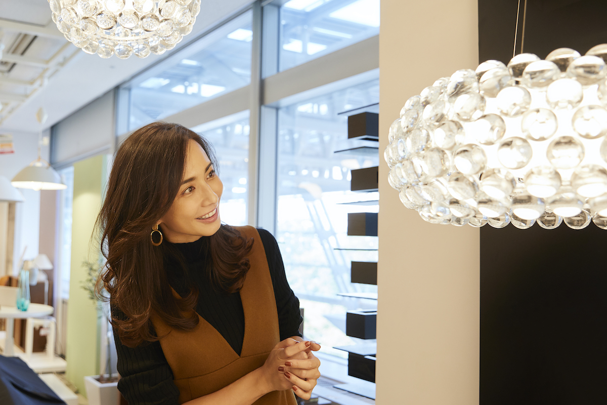 優木さんの目に留まったのは、暗闇で照らすとまるで空間の中に光の粒子が浮かんでいるような、とても幻想的な光を放つカボシェ。シェードにはアクリルを使用し、高い透明度を誇るPMMA樹脂を用いて宝石のような光の粒子の集合体を生み出している。デザインが凝ったものが好きな優木さんも、放つ光の加減をじっくり吟味。イタリア発の世界的な照明ブランド「FOSCARINI」の高い技術により、透明度の高いパーツが作られ、ガラス製にもひけを取らず、連続した球体が空間にぷっかりと浮かんでいるように見える美しい照明です。