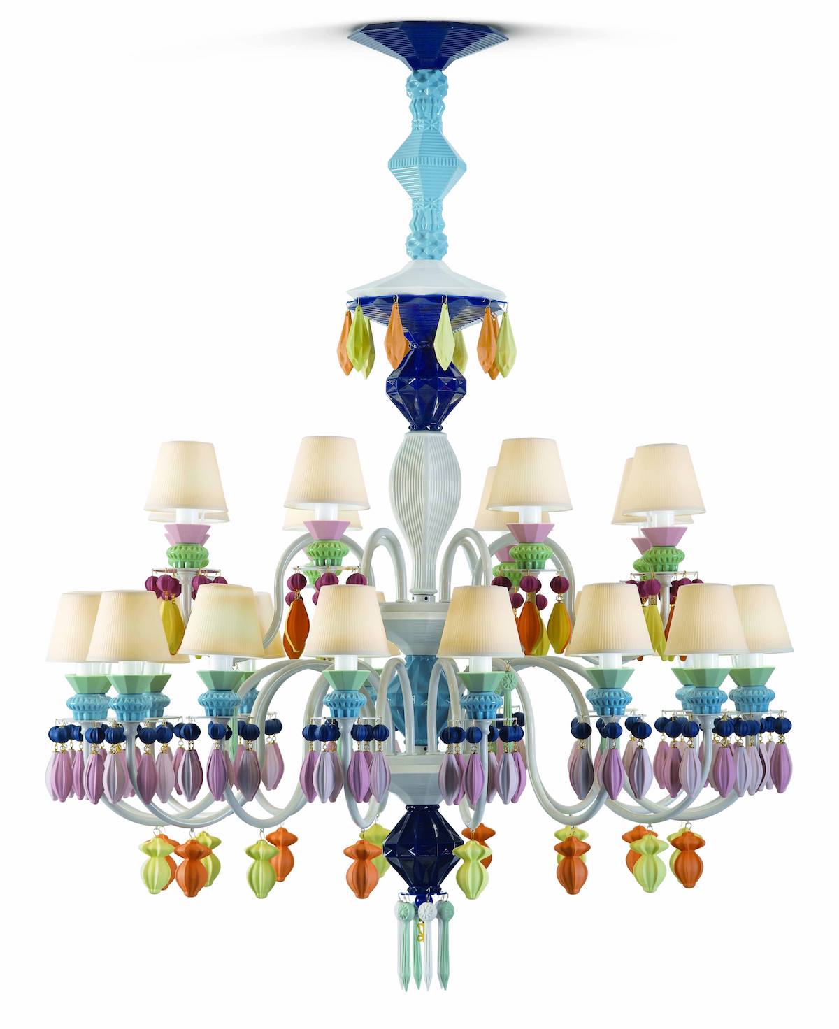 磁器を通して照らされる温もりのある柔らかな光が特徴の「ベル・ドゥ・ニュイ」。マットなポーセリンの彩りによる詩的な美しさを纏ったシャンデリアは、まさにポーセリンアートブランドであるリヤドロならでは。