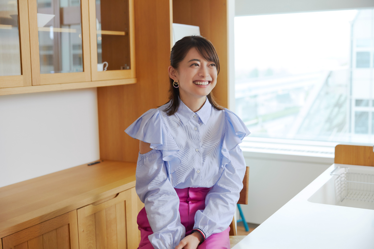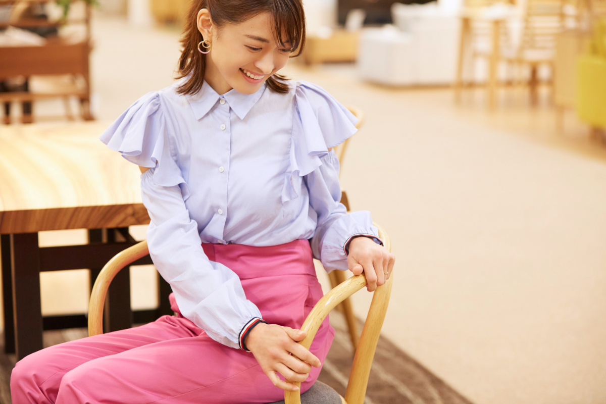 「このくらい近い距離感で、毎日一緒に夫とご飯を食べたいな」と微笑みながら座っていた乙葉さん。木材の素材を活かしたデザインと質感にも満足気。「このくらい明るい色のテーブルだと、ご飯も美味しく感じられそう」歳を重ねることに対して楽しさ、期待感を持つ乙葉さんの姿も、周囲を明るく照らす存在感でした。