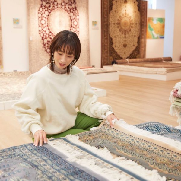 カーテン・絨毯などが並ぶコーナーで足を止めた、風間ゆみえさん。まるでスタイリングする洋服を選ぶように…