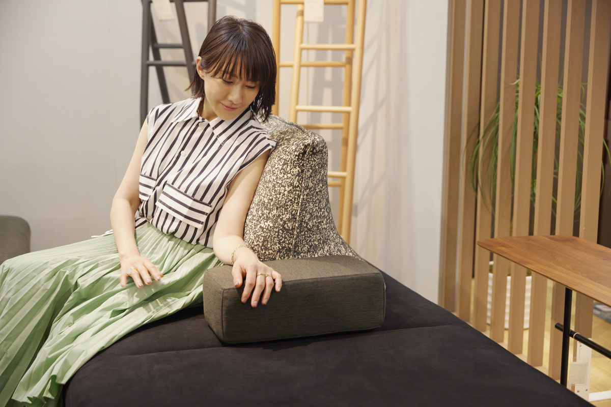 見つけたときに、こんな家具があるんだって驚きました。シェルフなのにデスクにも転用できるのは便利。展示品はパープルのスウェード調のファブリック で、素敵な色合い。カスタマイズはできるというお話だったので、ファブリックを変えるとどんな雰囲気になるのか気になりますね。