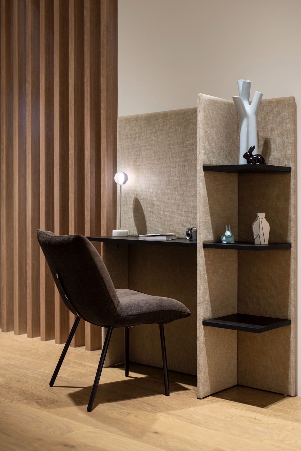 シェルフは、間仕切りとして視覚的な遮蔽と遮音を果たすだけではありません。奥行き31cmの棚板部分をデスクに利用すれば、多面的なワークステーションとしても使えます。天板や棚板の材質はブラックオーク、垂直のパネルはウレタンとファブリックでできていて、色はバリエーション豊富な展開です。