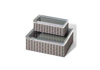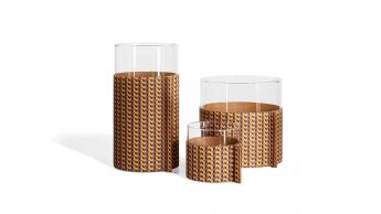Pelle Frau®レザーを使用したフラワーベースから、レザーの表面にデジタルプリントを施した「Motif Weavers」シリーズが新たに登場。2つのカラーバリエーションを展開し、セージはグリーン、ブラウン、ブルー系の構成でクールに、シナモンは絡み合ったモチーフをあたたかみのあるカラーリングで表現しています。