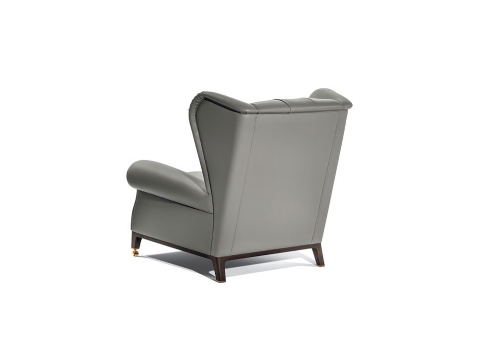 張り地はペレ・フラウ®レザーで、背もたれの前部には手動のカピトンネのディテールが施されています。アームチェアの背もたれの裏側にはレザートリムが施されています。